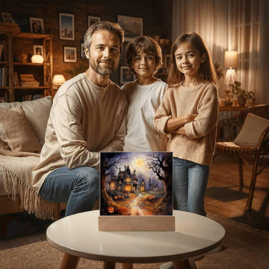 Chilling Manor: Haunted Halloween Mansion Acrylic Square Plaque with LED Lighted Wooden Base