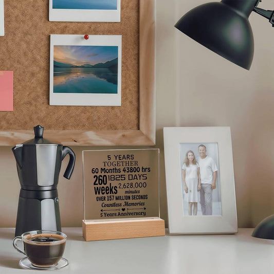 Anniversary Gift Five Years Together Acrylic Square Plaque with Lighted LED Wooden Base