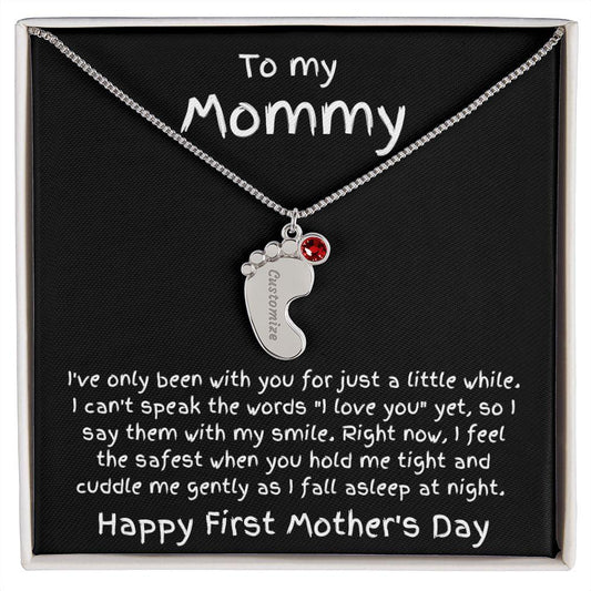 New Mom First Mother's Day Gift Engraved Baby Feet Birthstone Charm Necklace
