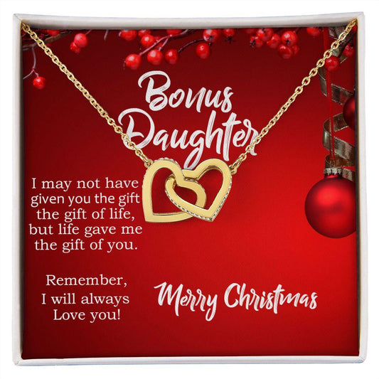 Christmas Gift for Bonus Daughter - Gift of Life - Interlocking Hearts Necklace with Message Card Gift Box