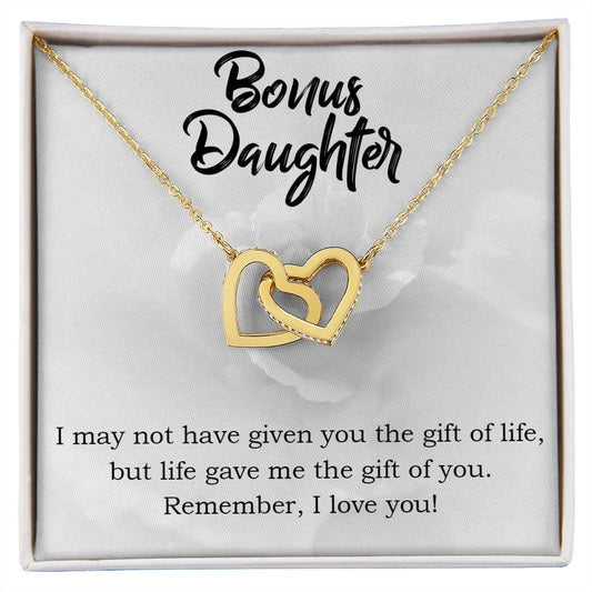 Gift for Bonus Daughter - Gift of Life - Interlocking Hearts Necklace Message Card Gift Box