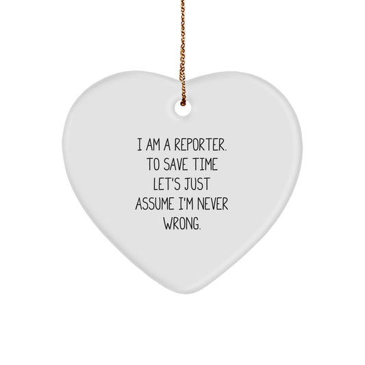 Funny Reporter Gifts from Friends to Men - 'I Am A Reporter. To Save Time Let's Just Assume I'm Never Wrong.' Heart Ornament for Christmas