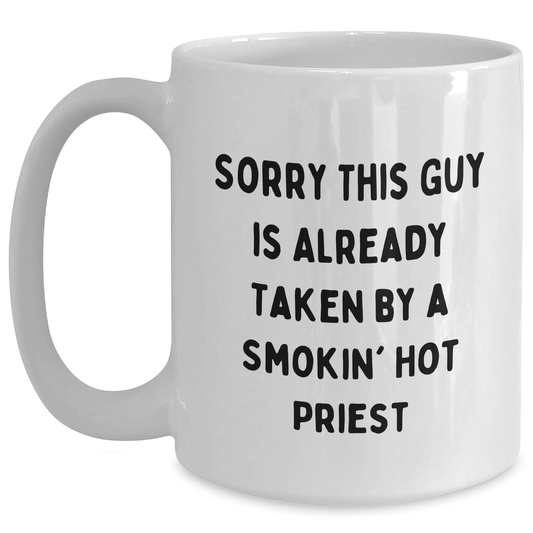 Funny Priest Gifts, Sorry This Guy Is Already Taken By A Smokin' Hot Priest Black Coffee Mug, Father's Day Unique Gifts from Friends and Family for Priests