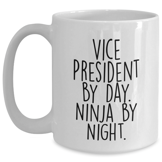 Vice President Gifts from Friends, Funny White Coffee Mug for Graduation, 'Vice President By Day. Ninja By Night.' Quote