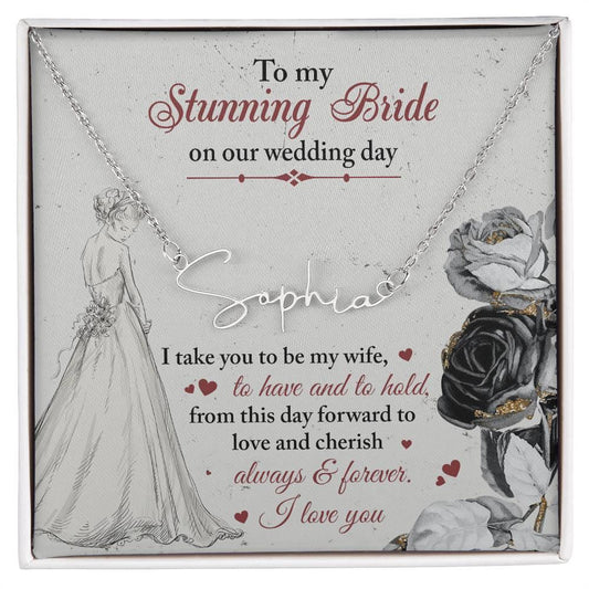 To My Stunning Bride on Our Wedding Day, I Take You to be My Wife Signature Style Name Necklace