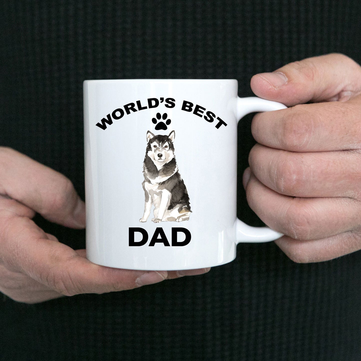 These Alaskan Malamute Best Dad ceramic mugs are available in 11 and 15-ounce sizes, perfect for coffee, tea, hot chocolate, milk, or any beverage. The two-tone mugs are only available in the 11-ounce size. They feature a large C-shaped handle that's easy to grip, and the custom design is printed on both sides, making them suitable for both right- and left-handed users.