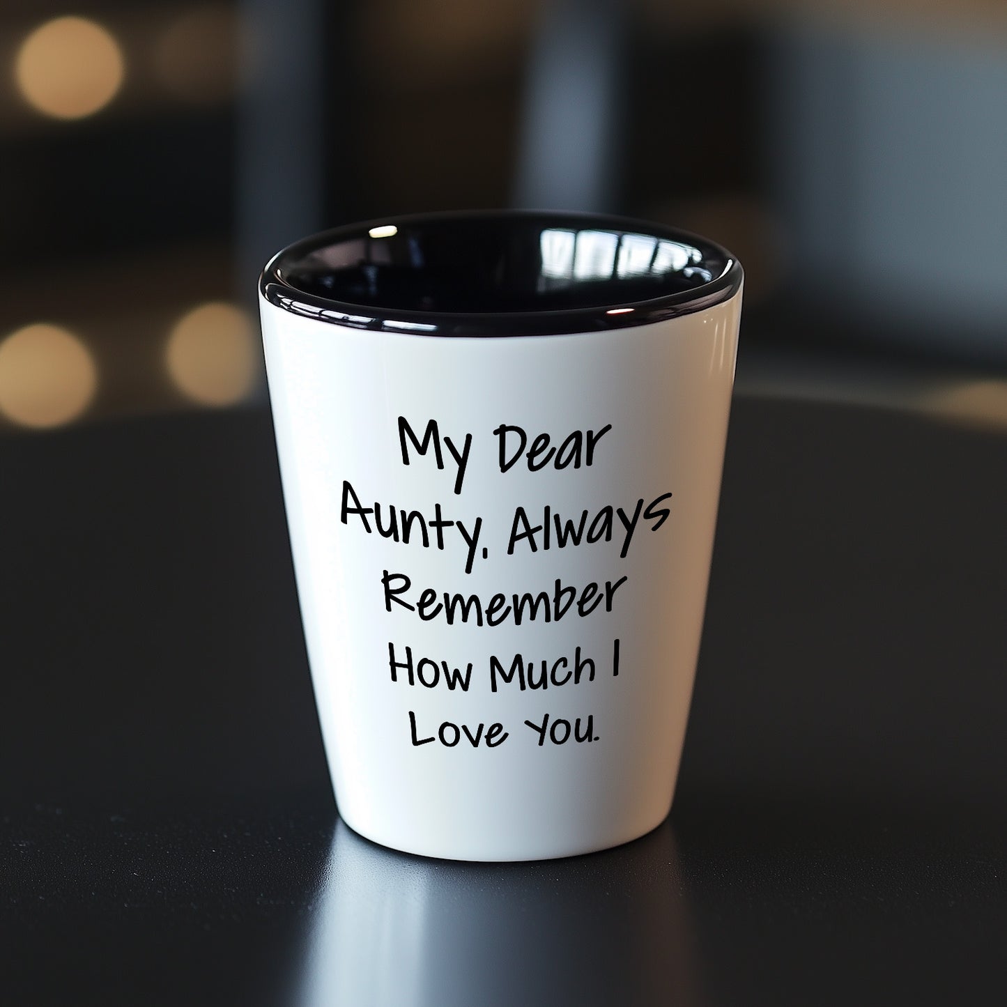 Introducing the perfect Valentine's gift for your beloved Aunty: a beautiful and functional "My Dear Aunty, Always Remember How Much I Love You" shot glass! Made from high-quality ceramic, this 1.5-oz capacity shot glass serves as both a lovely token of appreciation and a practical addition to Aunty's daily routine. Its microwave and dishwasher-safe design ensures easy maintenance, making it a gift that she can enjoy for years to come. Whether you're celebrating Valentine's Day, a birthday, or simply expressing your love and gratitude, this shot glass beautifully conveys your feelings. Every time Aunty uses this shot glass, she’ll be reminded of your love and thoughtfulness. Show your Aunty just how much you care with this heartwarming gift. Don’t miss the chance to make her feel extra special on Valentine’s Day! This thoughtful gift is perfect for any occasion—whether it's Valentine's Day, Mother's Day, or simply a heartfelt "thank you." It’s a unique and personalized way to express your appreciation. So why wait? Get your "My Dear Aunty, Always Remember How Much I Love You" shot glass today and spread some love and joy to the special Aunty in your life!