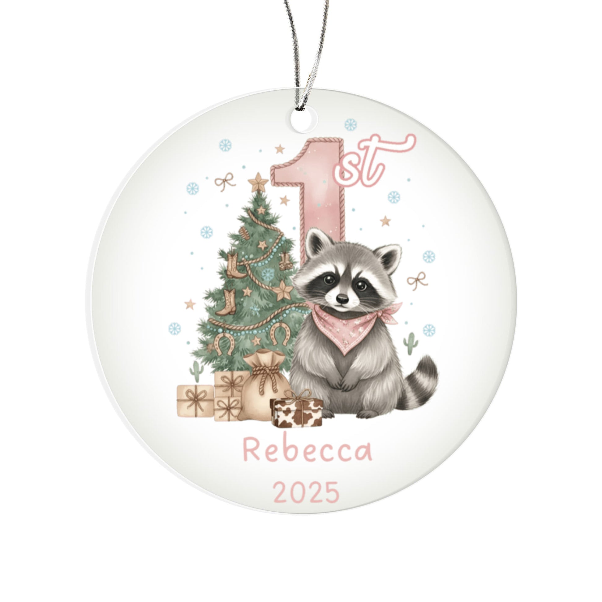 Baby Girl First Christmas Raccoon Western Style Acrylic Ornament – Personalized Name and Year – Holiday Keepsake – 3” Clear Round Ornament for Newborns, Infants