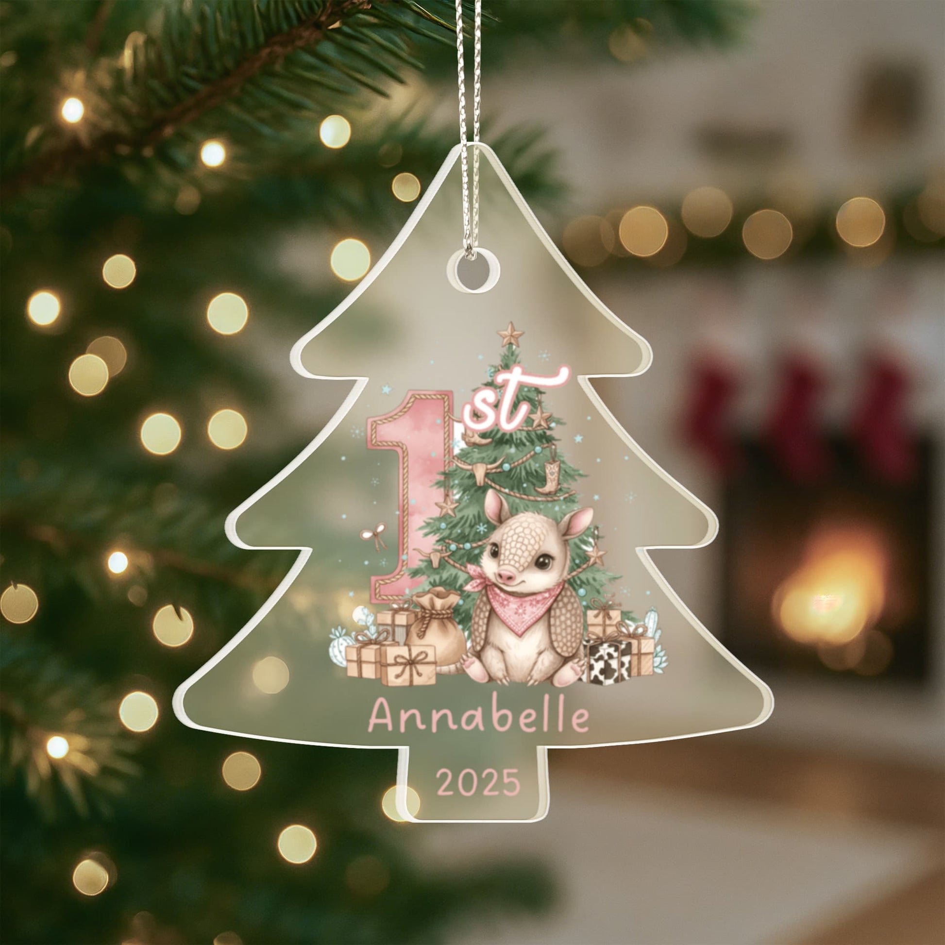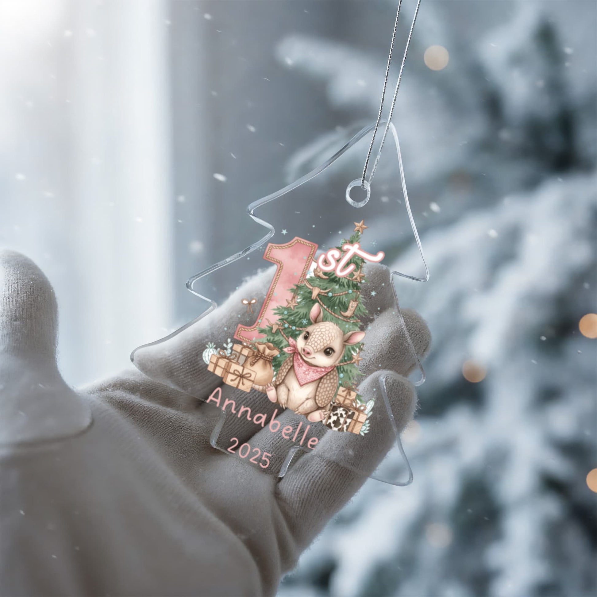 Baby's First Christmas Tree Adorable Armadillo Acrylic Ornament – Personalized Name and Year – Western Theme Holiday Keepsake – 3” Clear Round Ornament for Newborn. Infant Girls