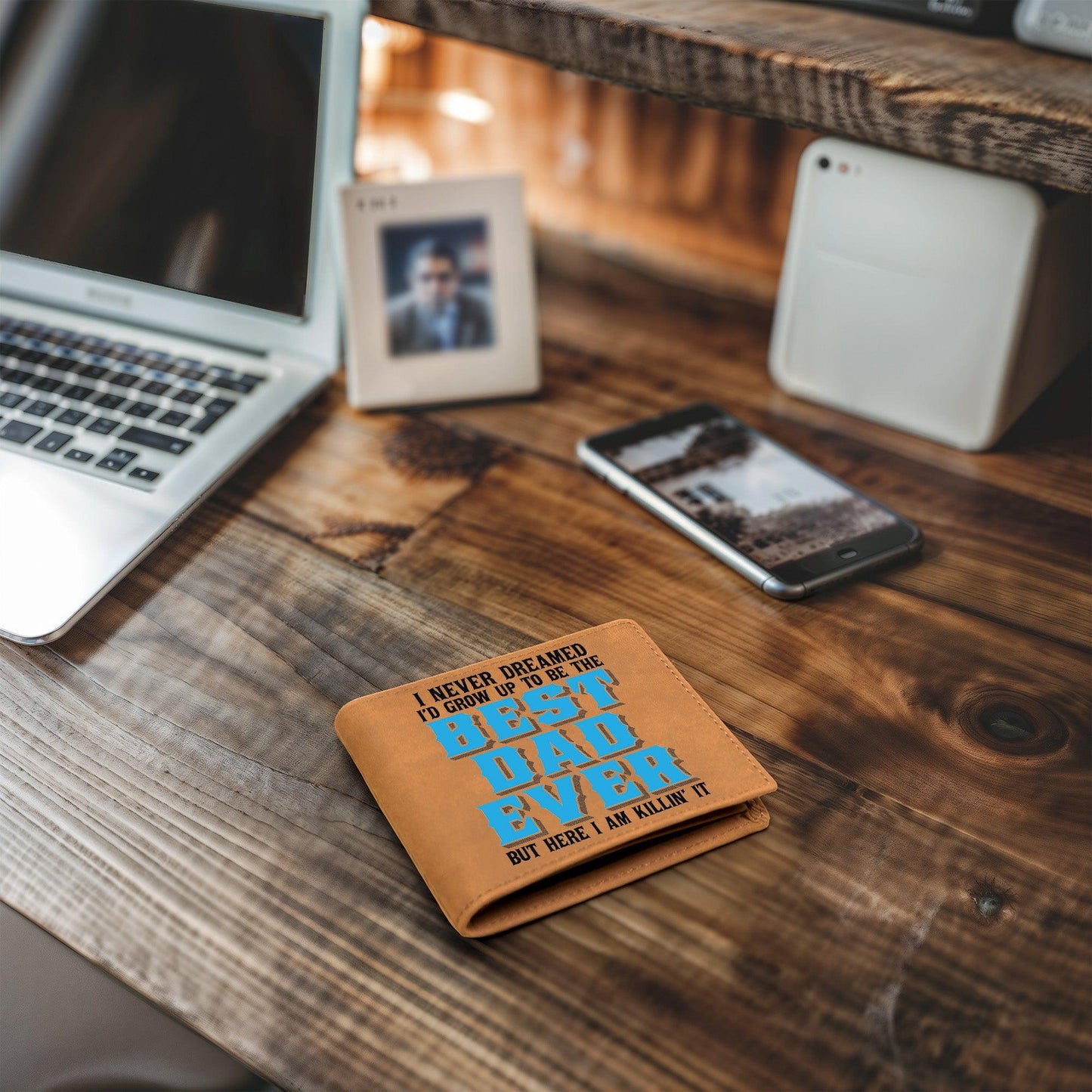 Great Gift for Dad, the Leather Wallet has the phrase "I never dreamed I would grow up to be the Best Dad Ever but here I am Killin' it"
