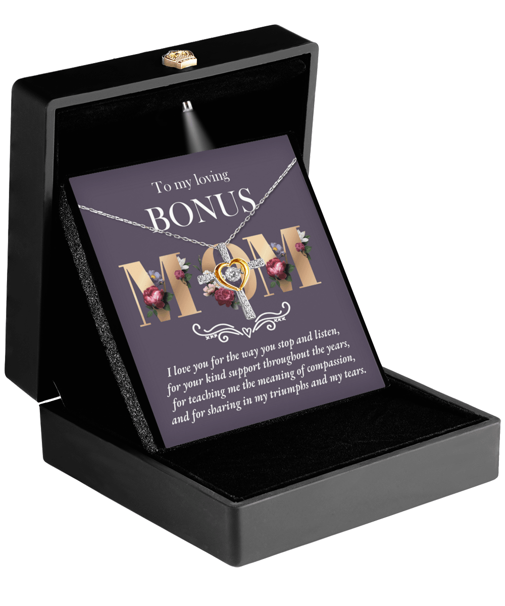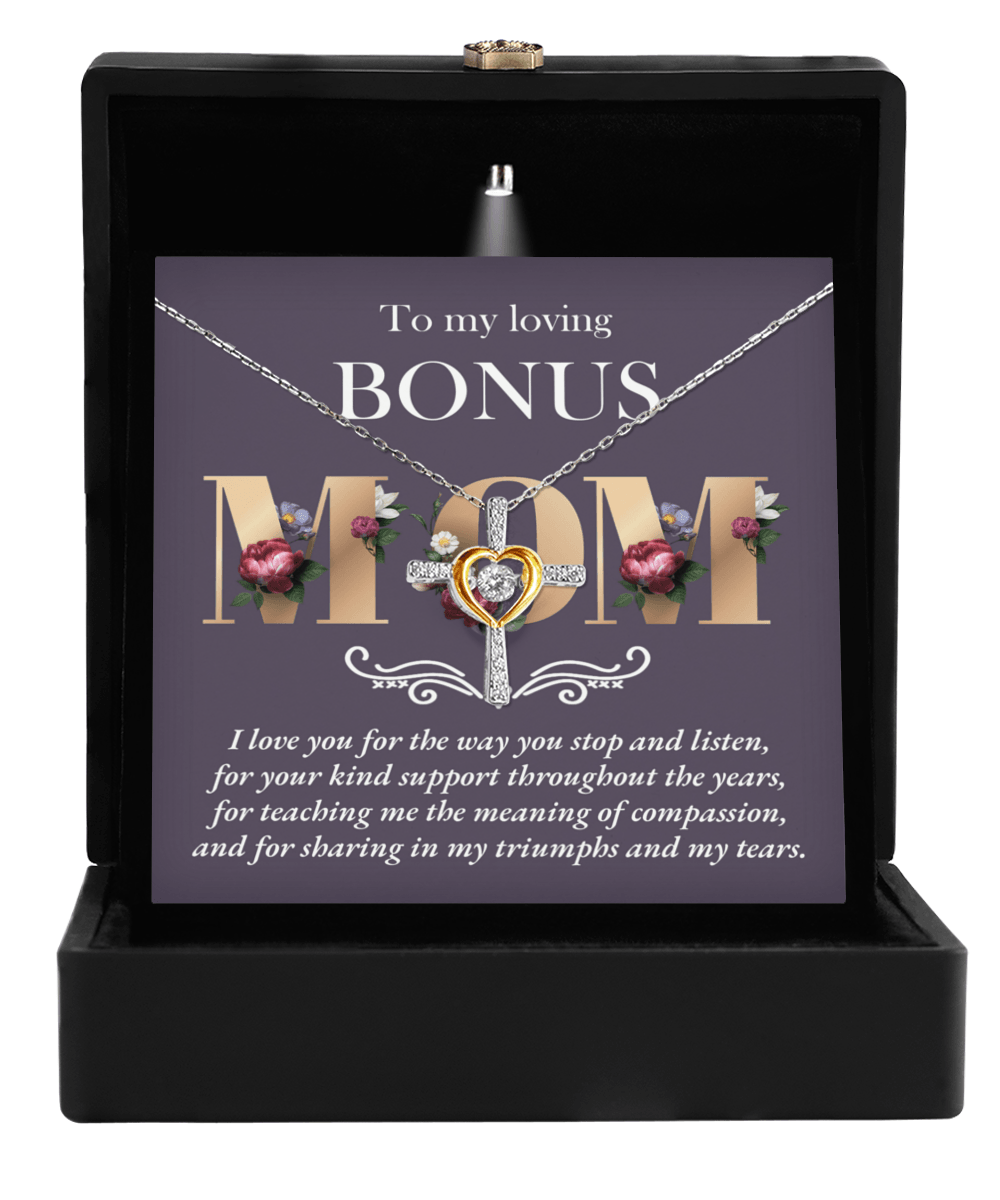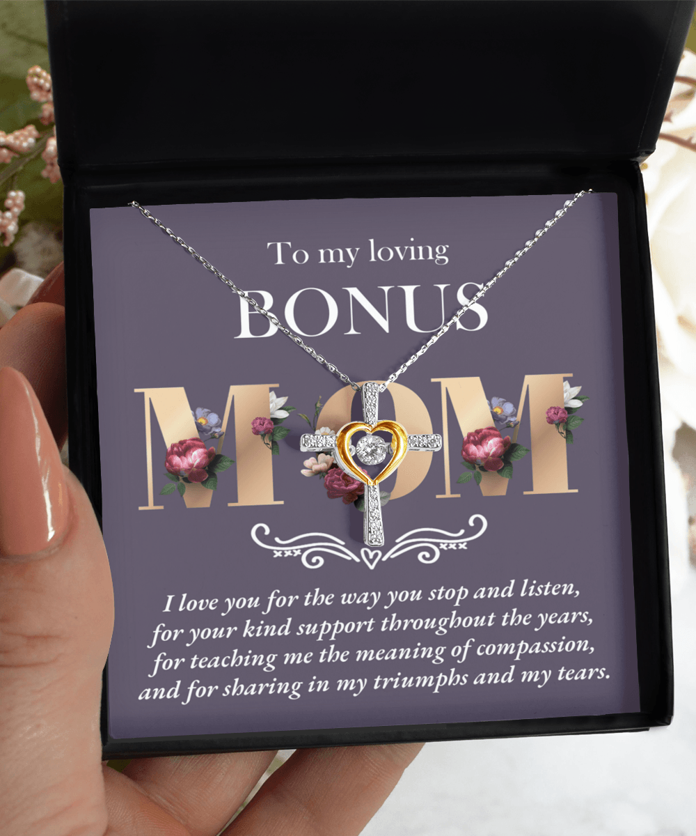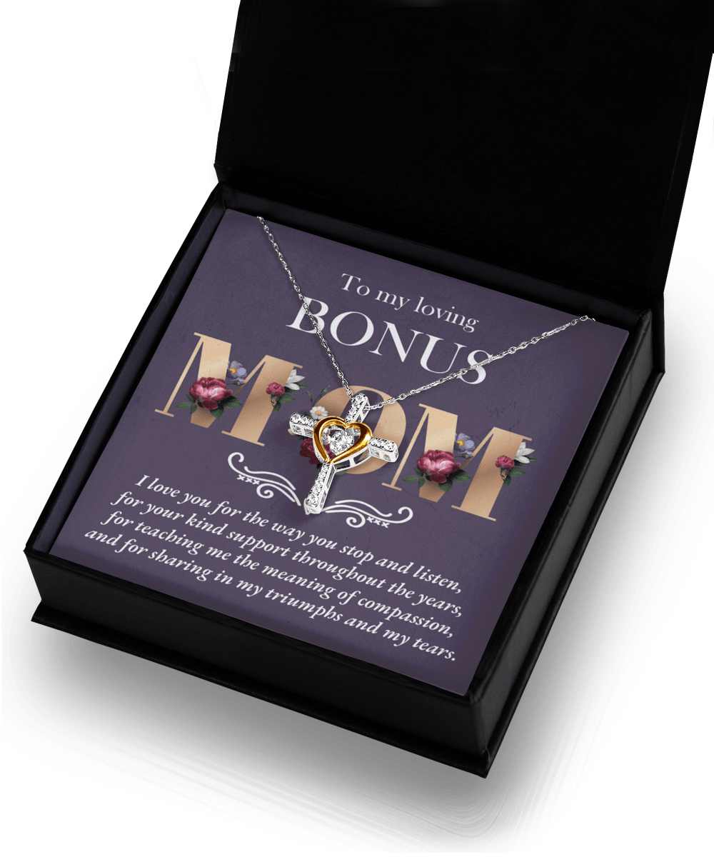 Melt Mom's heart with this exquisite cross necklace and heartfelt message, "To my loving bonus mom, I love you for the way you stop and listen, for your kind support throughout the years, for teaching me the meaning of compassion, and for sharing my triumphs and my tears."