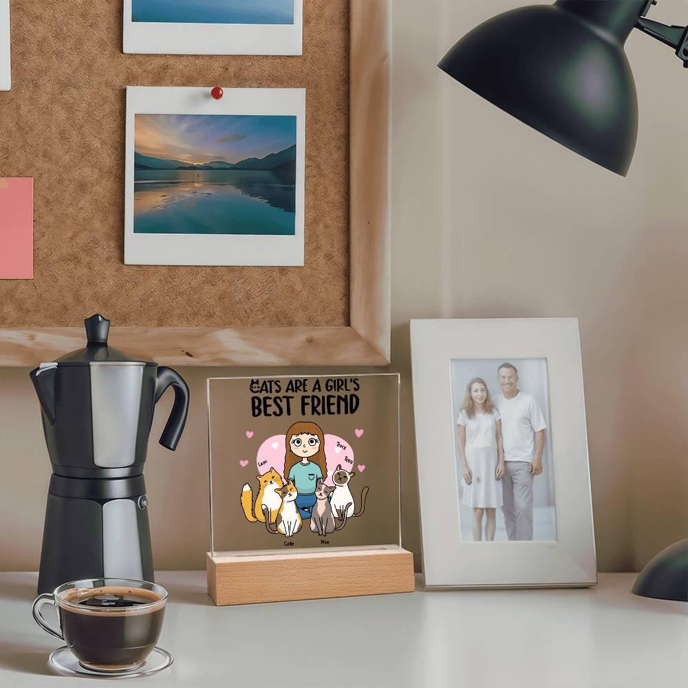 Whisker-Kissed Design: The design features a charming feline silhouette, a heartwarming "Cats are a Girl's Best Friend" message, and your personalized names, all encased in an acrylic plaque that adds a touch of cat-loving charm to your decor.