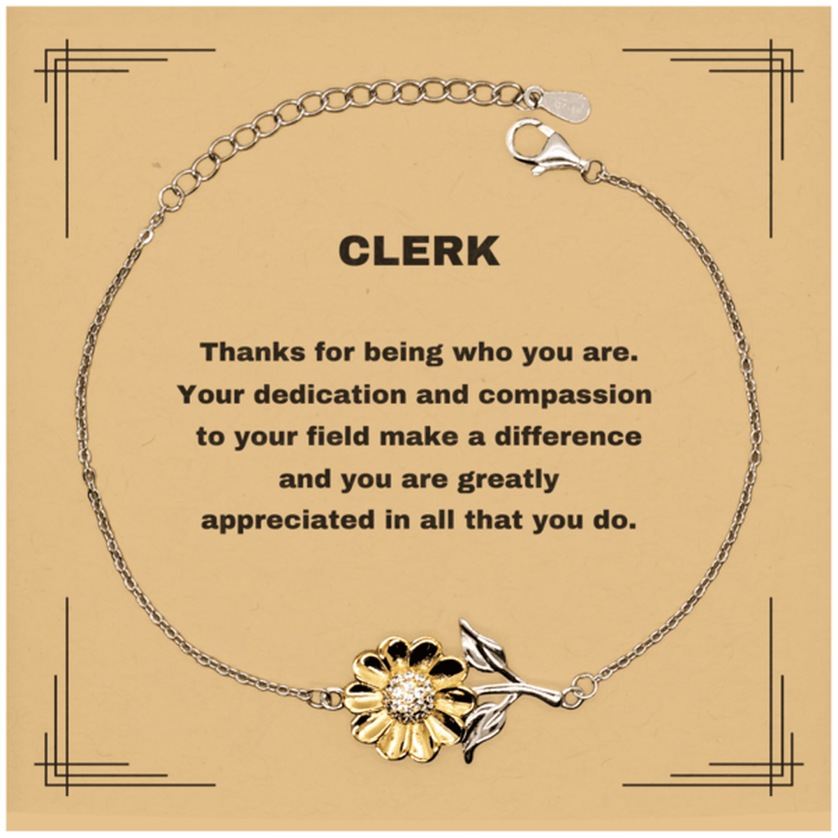 - PERFECT Clerk GIFT - Sunflower represents happiness, optimism, honesty, longevity, peace, admiration, and devotion. This beautiful Sunflower Bracelet is a premium quality gift for Clerk that's a perfect way to express your love.