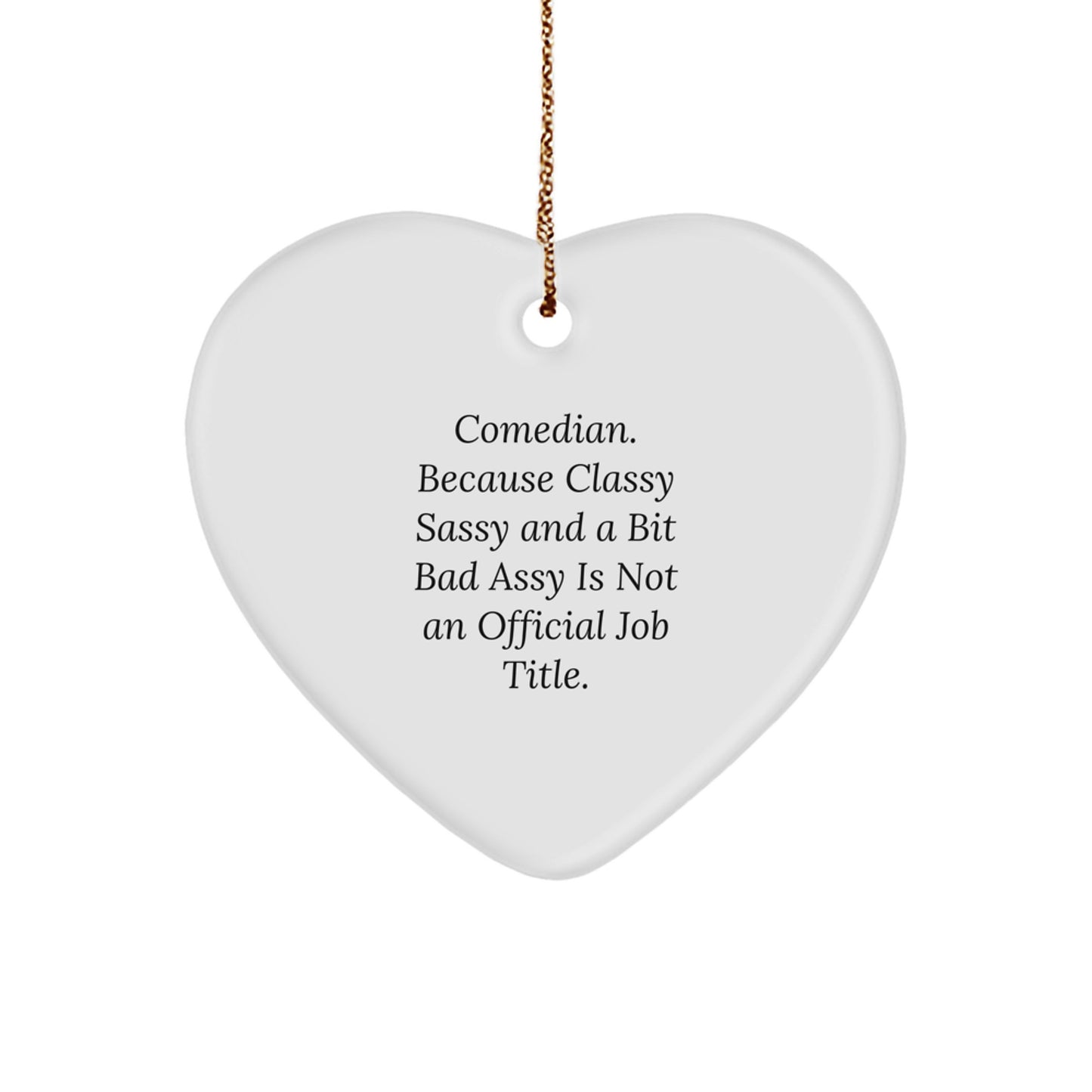 - Our Comedian Heart Ornament is a unique and thoughtful gift for any comedian enthusiast. Made from sturdy MDF with a high-gloss plastic finish, it's lightweight, resistant to breaking, and easy to hang. The vibrant and funny quote, 'Classy Sassy And A Bit Fearlessy Is Not An Official Job Title.', is sure to put a smile on anyone's face. Whether you're gifting it to a friend, family member, or coworker, this ornament is the perfect way to show your appreciation and humor.