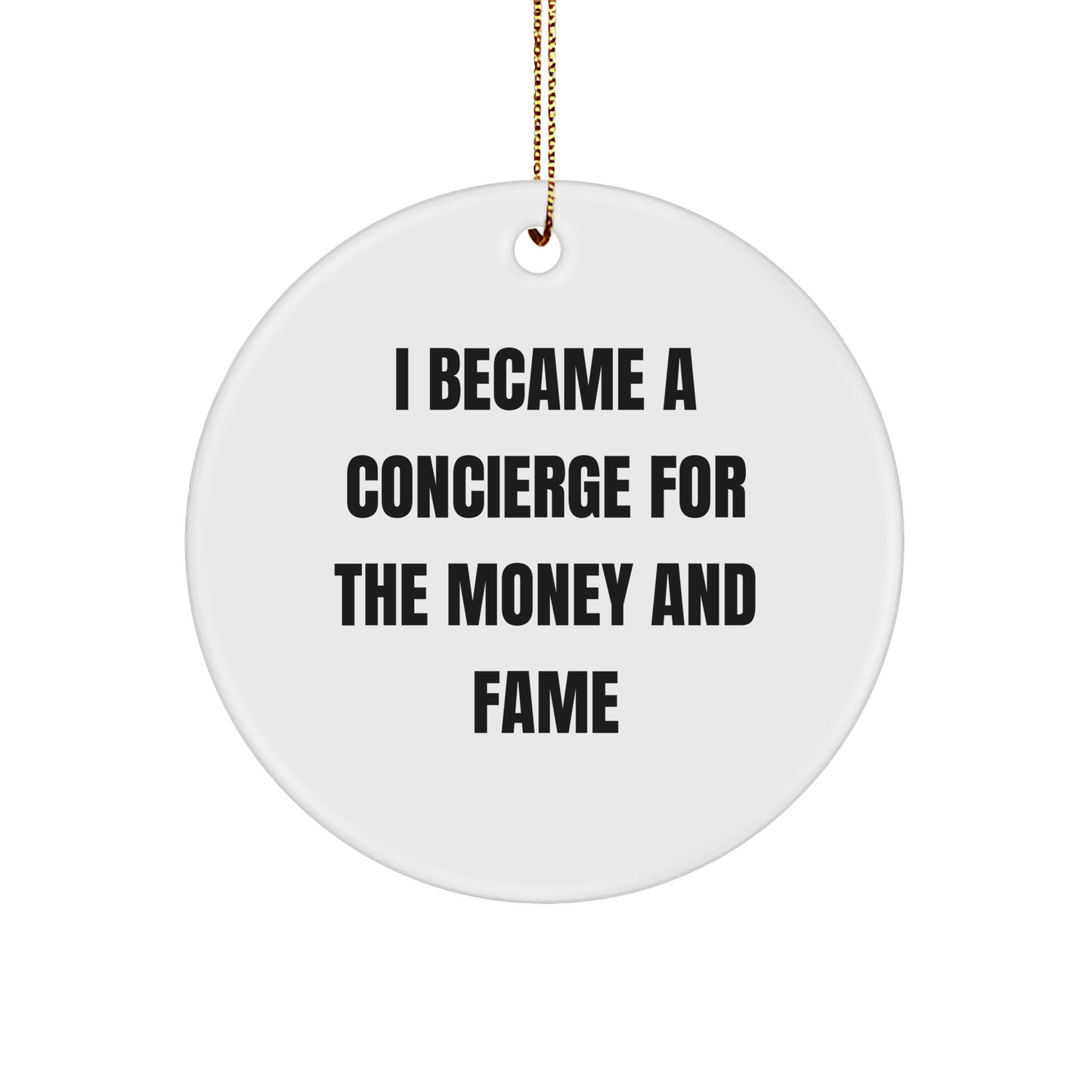 - This Circle Ornament is the perfect way to show your friends who work as concierges that you appreciate their hard work and dedication. The quote 'I Became A Concierge For The Money And Fame' adds a touch of humor and whimsy to this unique gift.