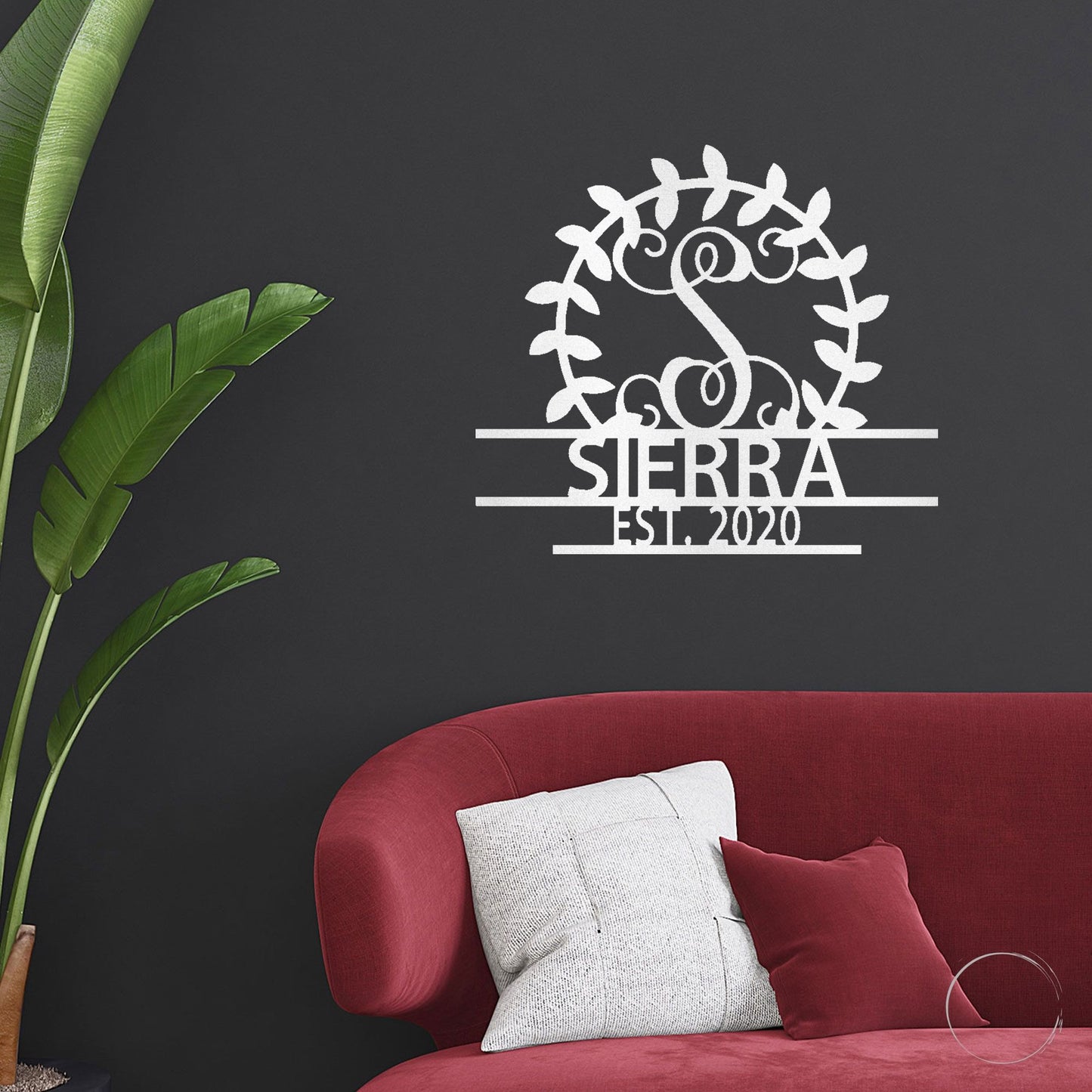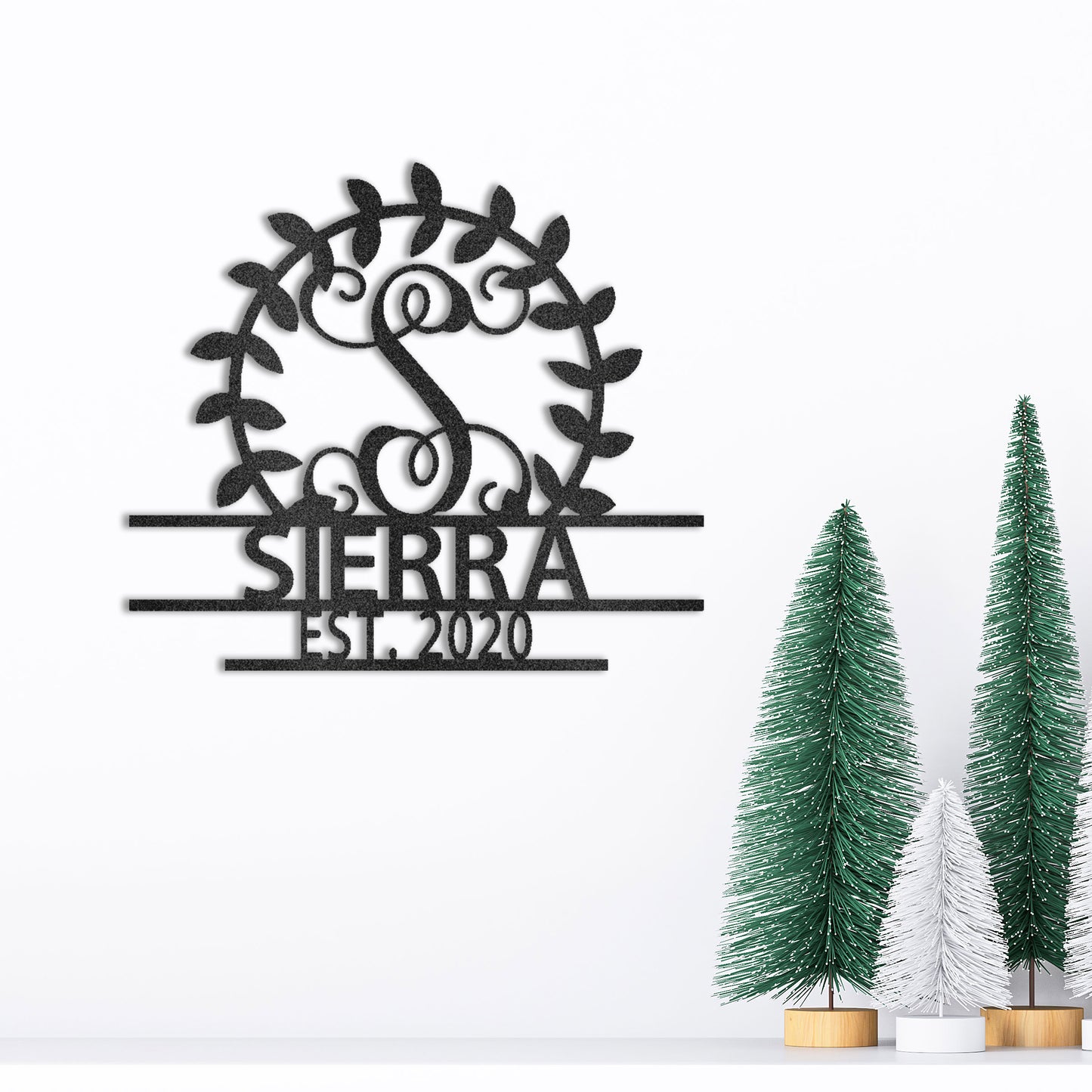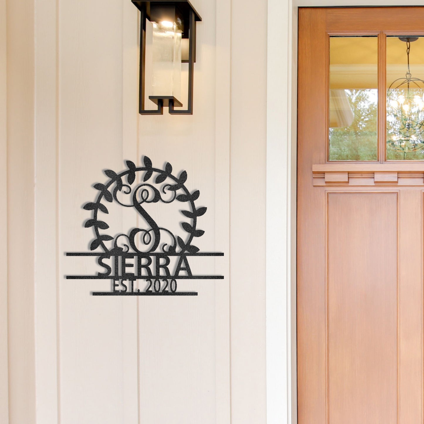 Crafted from premium 16-gauge American steel, this custom sign combines modern monogram flair with rustic charm. The top showcases your family initial framed in a laurel wreath, while your last name and "EST." year complete the design in bold, clean lines.