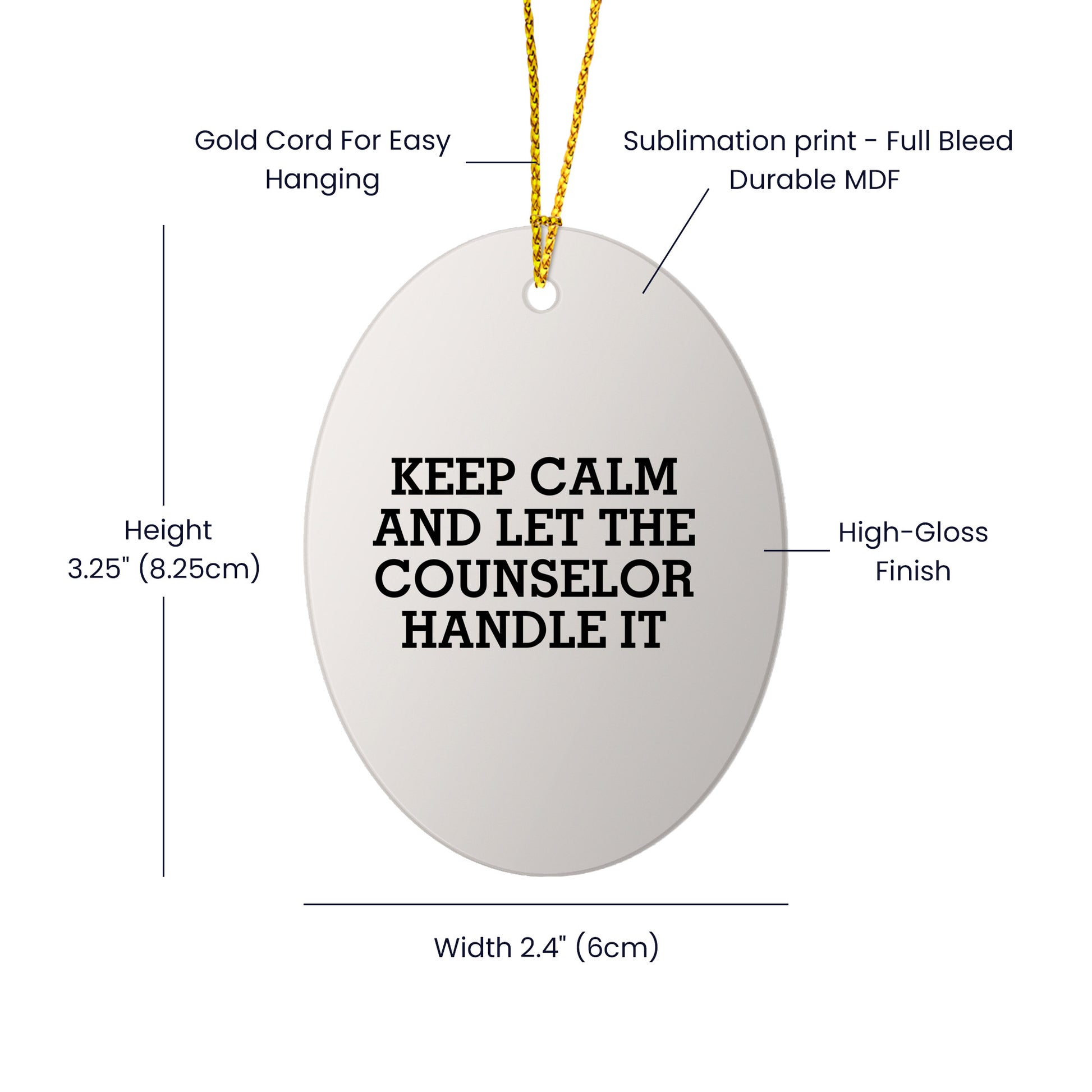 - Show your appreciation and gratitude for the counselor in your life with our 'Keep Calm And Let The Counselor Handle It' Oval Ornament. Made from sturdy MDF with a high-gloss plastic finish, this ornament is not only visually appealing but also long-lasting. Its vibrant colors and funny quote will brighten up any room and make a great conversation starter. Whether you're shopping for a family member, friend, or coworker, this ornament is sure to bring some humor and joy to their day.