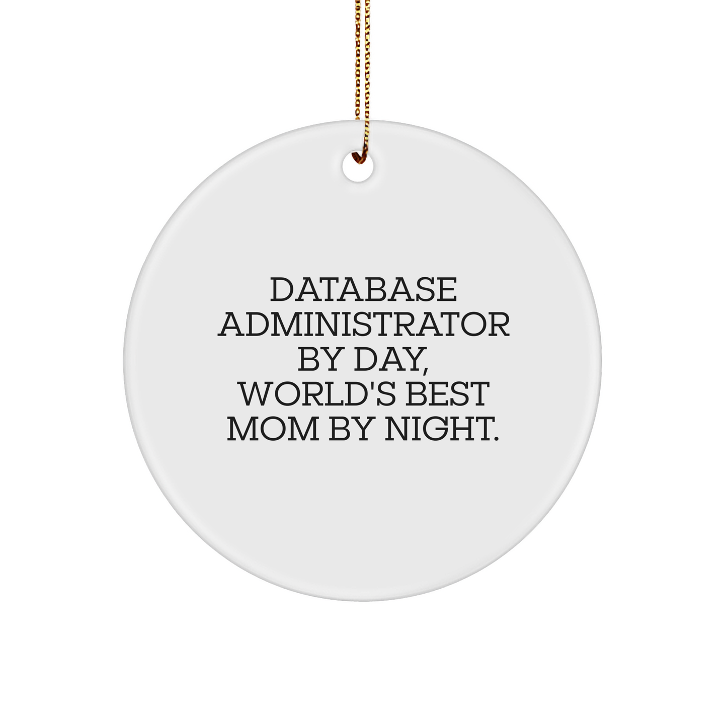 - This Circle Ornament is a thoughtful and unique gift for any Database Administrator, making it a great choice for coworkers, friends, or family members. With its sturdy MDF construction and high-gloss plastic finish, it's designed to last for years to come. 'Database Administrator by day, World's Best Mom by night' - a funny and relatable quote that's sure to bring a smile to their face. Don't miss out and make their day a little brighter!