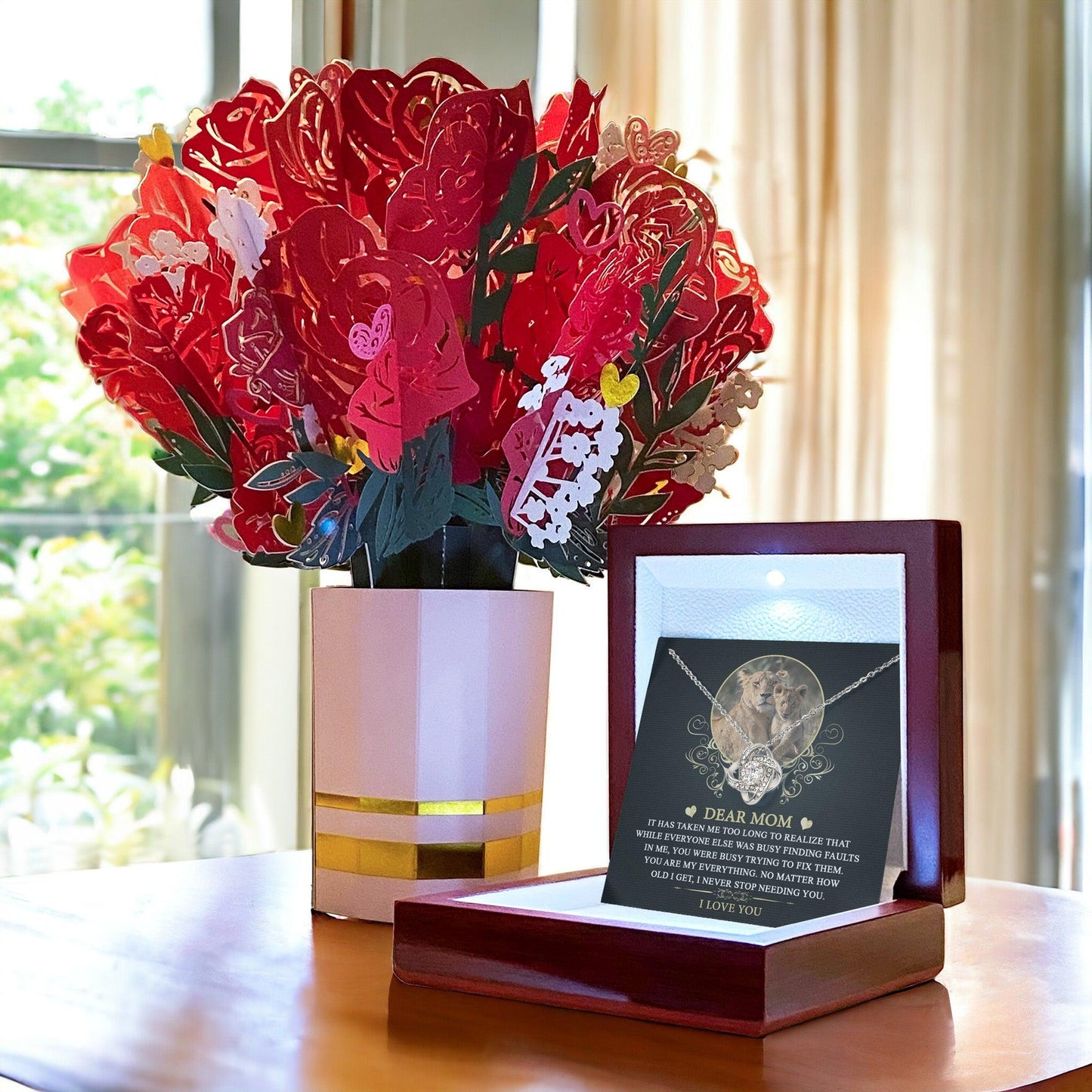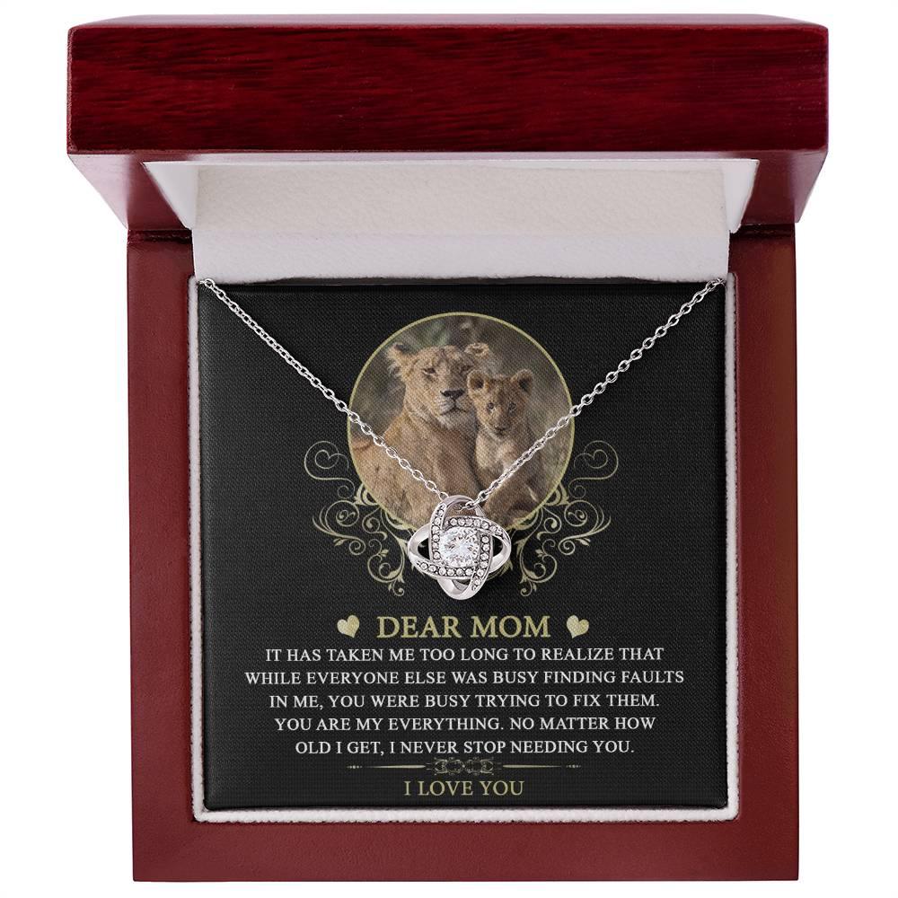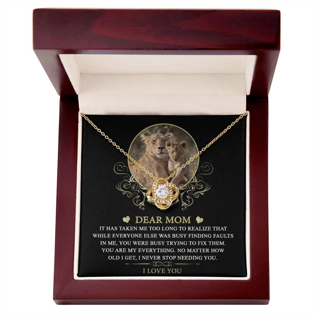 Make mom's heart melt with this gorgeous necklace and heartfelt message, "Dear Mom, It has taken me too long to realize that while everyone else was busy finding faults in me, you were busy trying to fix them. You are my everything. No matter how old I get, I never stop needing you. I love you."