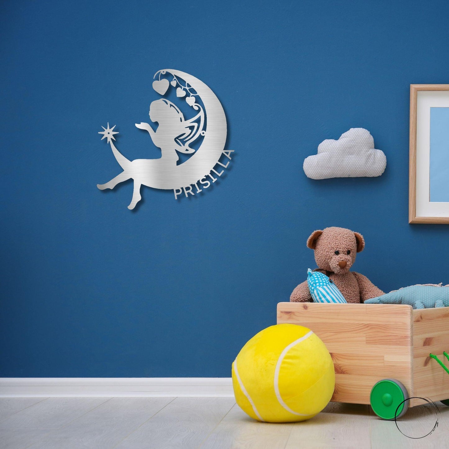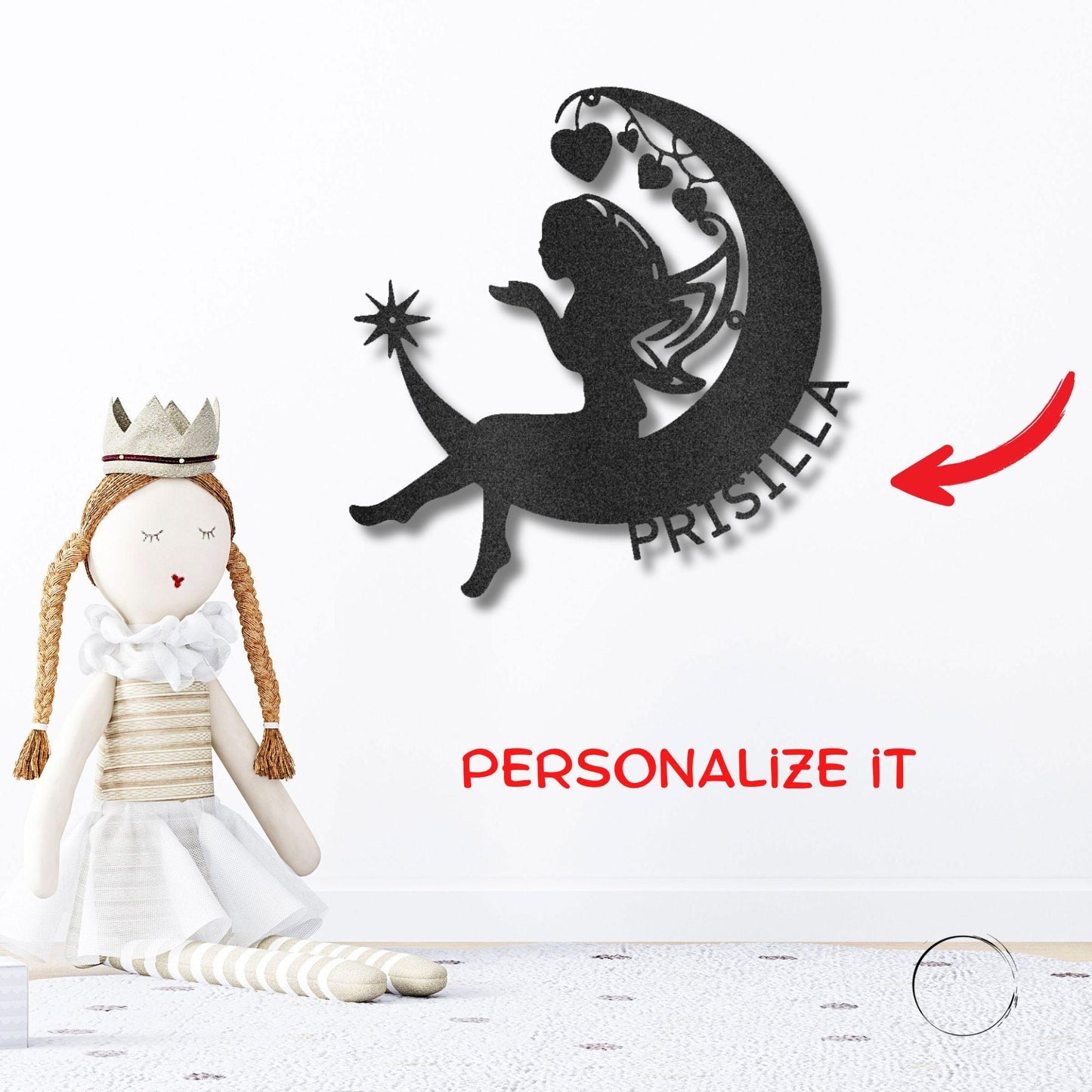 Fairy Moon wall sign is made with 16-gauge mild steel, laser-cut and is powder-coated for maximum durability to be used both indoors and outdoors. Made and shipped free from the USA. Please allow 10 - 21 days for cutting and powder coating.