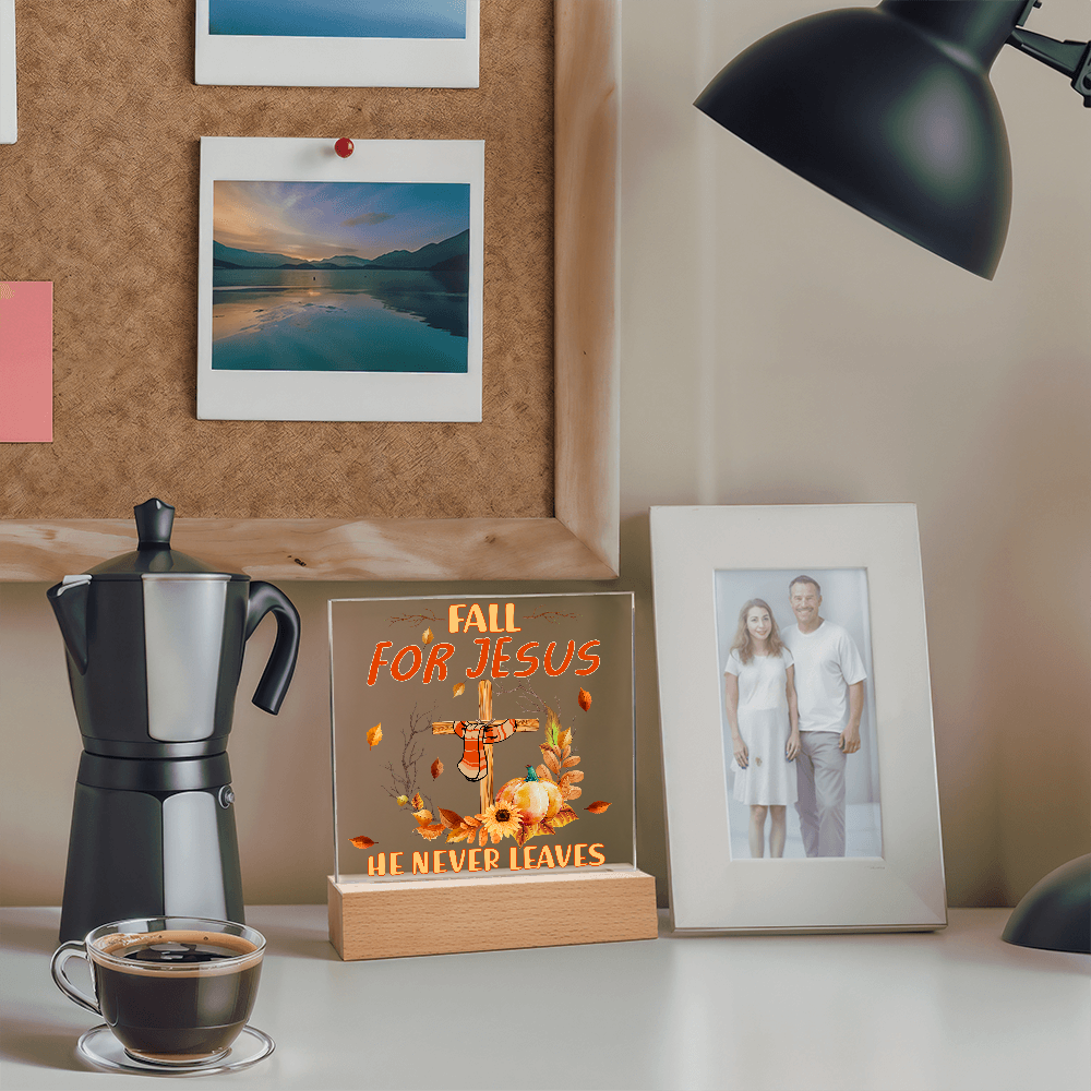 Celebrate faith and fall together with this inspiring “Fall for Jesus – He Never Leaves” acrylic plaque. Featuring a radiant cross wrapped in an autumn scarf surrounded by pumpkins, sunflowers, and falling leaves, this design beautifully blends the warmth of the season with the steadfast love of Christ.