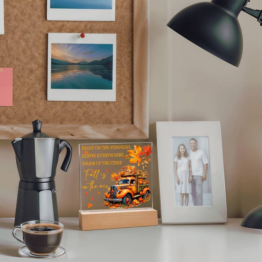 Bring a touch of cozy autumn magic into your home with this beautifully lit acrylic plaque featuring a vintage pumpkin truck, fluttering leaves, and a heartwarming seasonal quote. Perfect for mantle displays, entry tables, or thoughtful fall gifts!