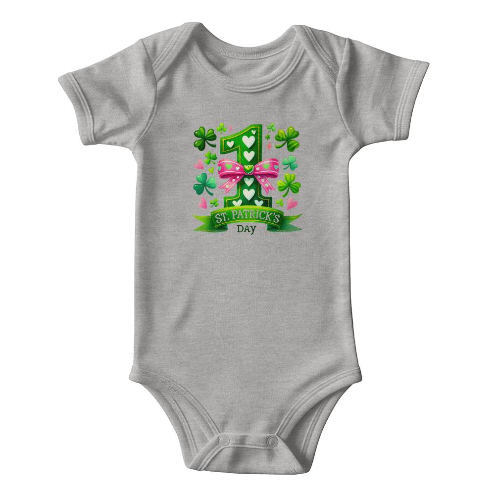 Dress your little one in festive charm with this First St. Patrick’s Day baby girl bodysuit! Featuring a lucky shamrock, pink polka-dot bow, and cute heart accents, this adorable holiday outfit is perfect for family gatherings, holiday photos, and making lucky memories.