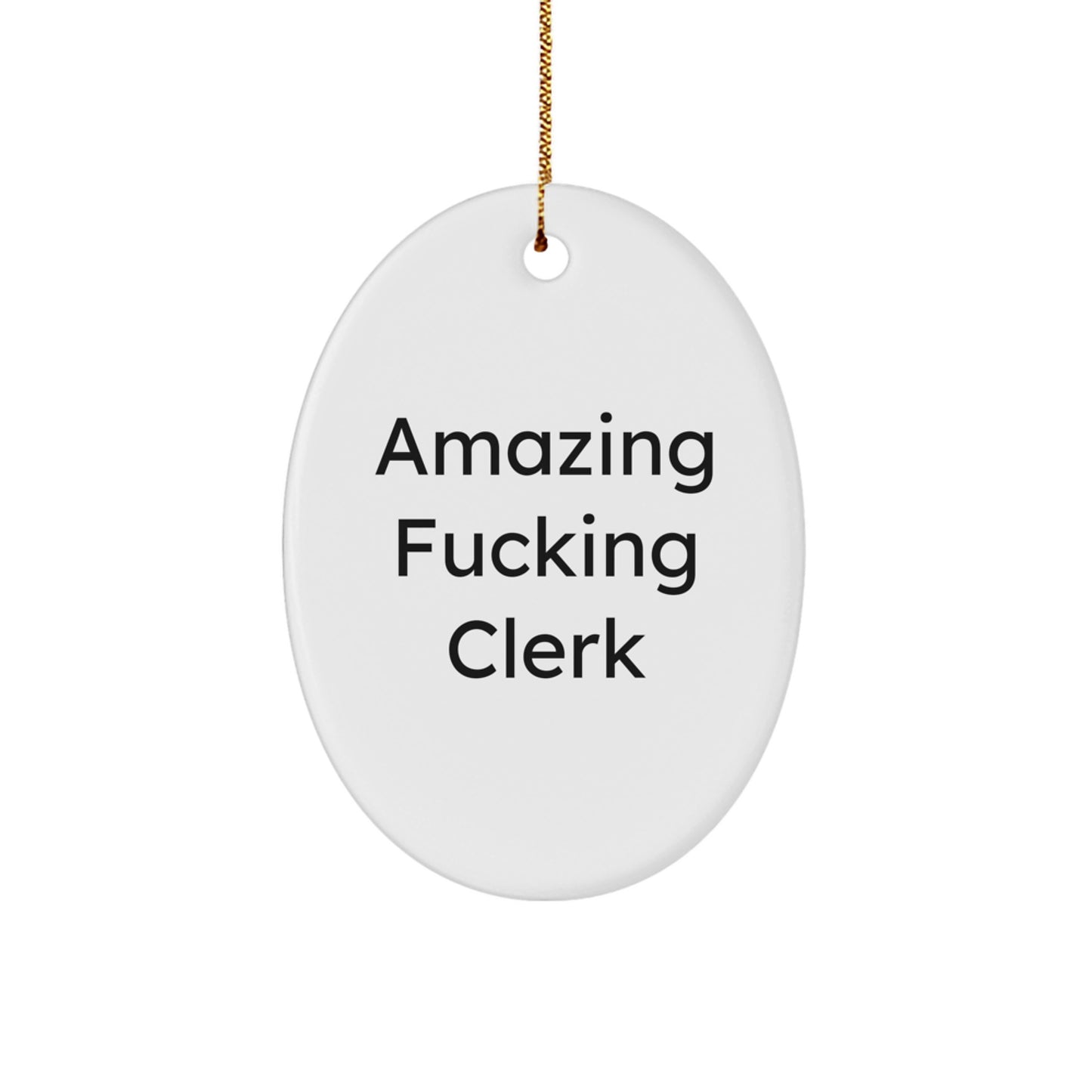 - This beautiful Oval Ornament is handcrafted from sturdy MDF with a high-gloss plastic finish, ensuring a long-lasting and vibrant design. The quote 'Amazing F--king Clerk' is printed from edge-to-edge via Sublimation, making it a great gift for any office clerk or fan.