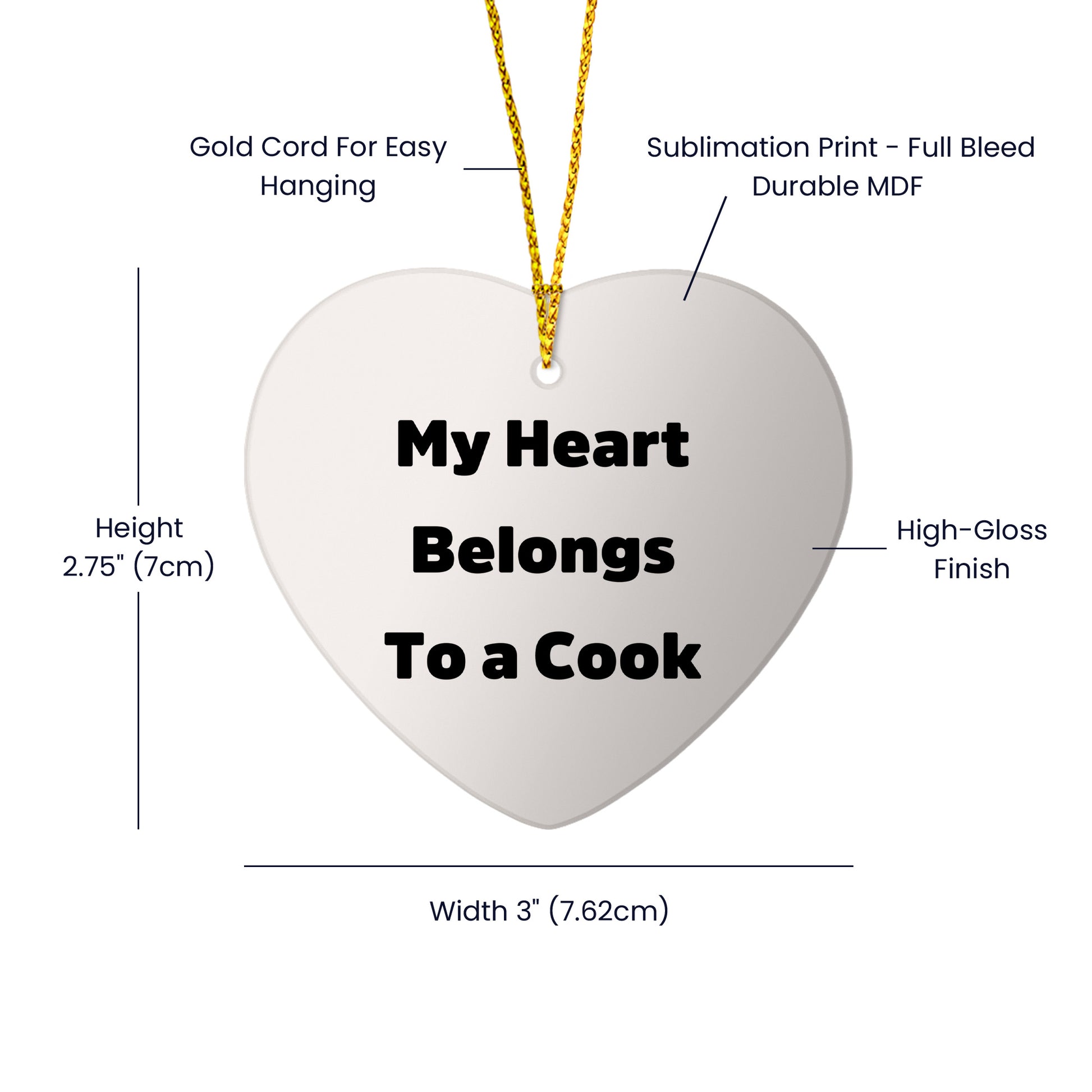 Funny Cook Gifts from Friends - My Heart Belongs To A Cook Heart Ornament, Unique Christmas Unique Gifts for Cook, Heart-Shaped Ornament with Gold Cord
