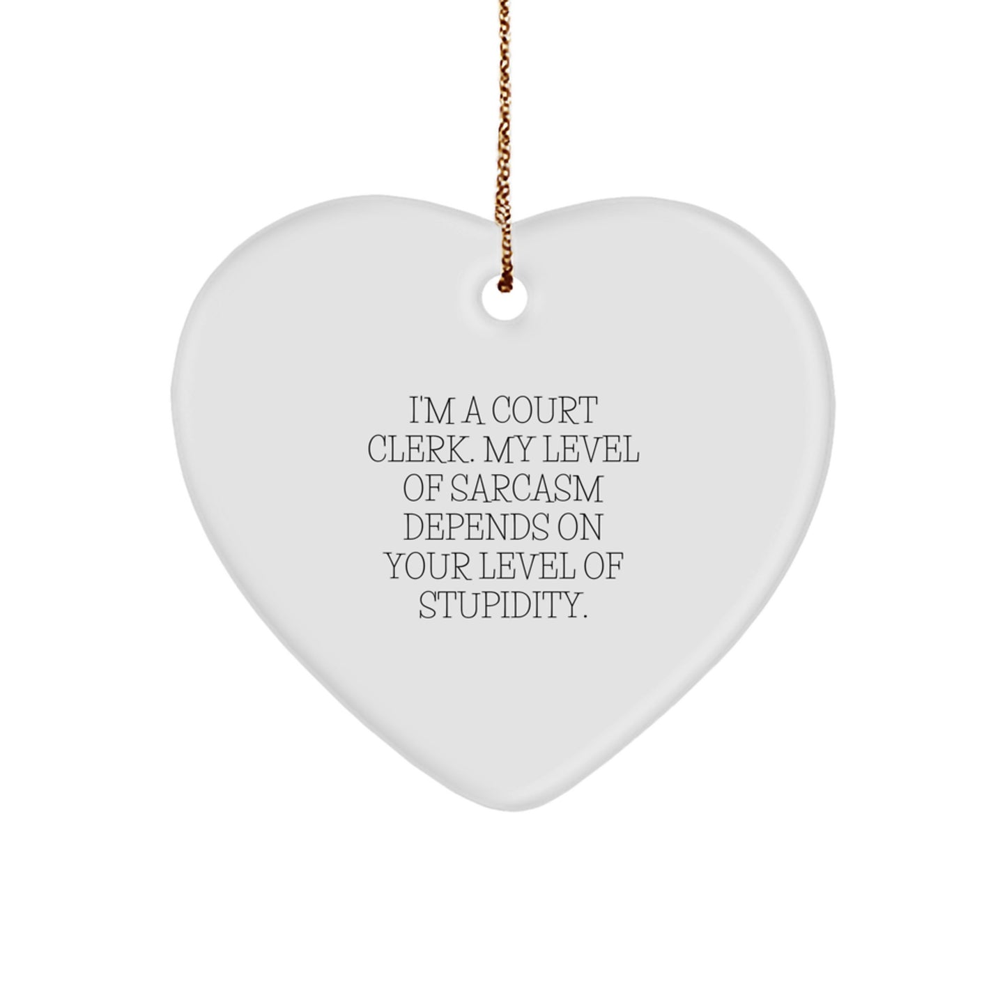 - Our 'I'm A Court Clerk. My Level Of Sarcasm Depends On Your Level Of Stupidity.' Heart Ornament is the ideal gift for any Court Clerk, making them laugh and smile every time they see it. This unique gift is crafted from sturdy MDF with a high-gloss plastic finish, ensuring it will last for years to come. The vibrant printing from edge-to-edge via Sublimation process guarantees bright, vivid colors that will catch the eye of everyone who sees it.