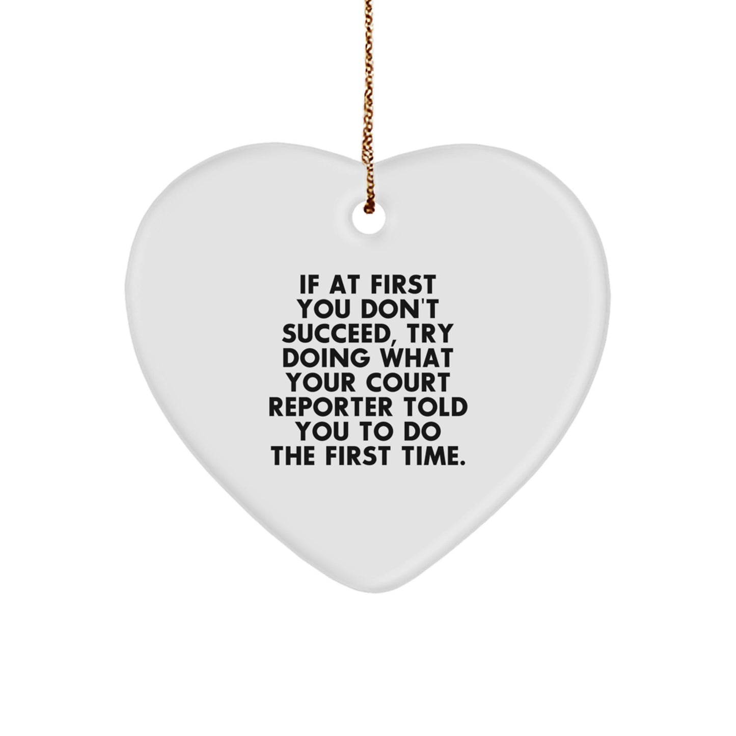 - Experience the joy of a 'If At First You Don't Succeed, Try Doing What Your Court Reporter Told You To Do The First Time.' heart ornament in your home, perfect for celebrating Christmas with loved ones, and a unique gift idea for your favorite Court Reporter, complete with a festive gold cord for easy hanging.