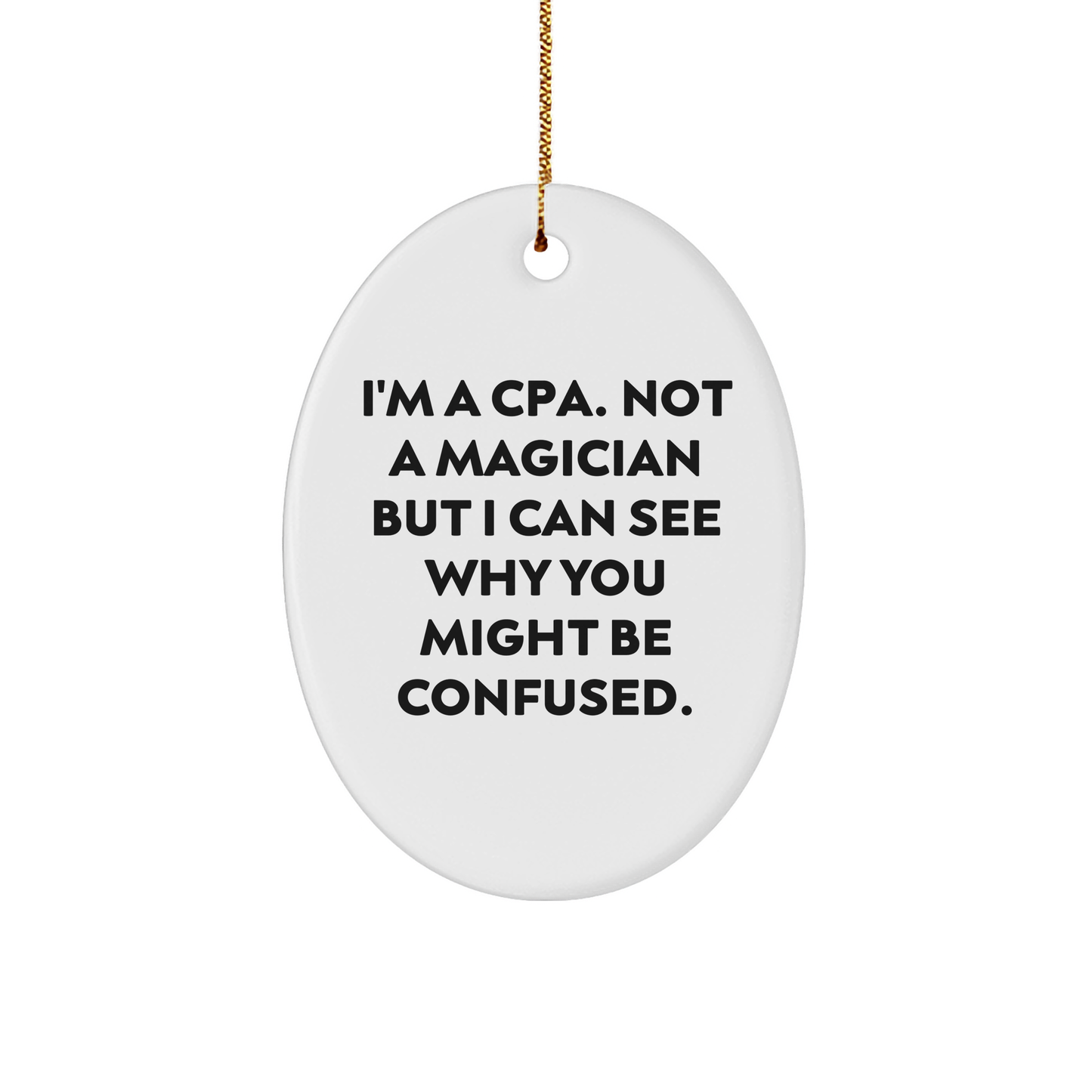 Are you a CPA looking for a unique gift or a friend trying to find the perfect present for a CPA? Look no further! This Oval Ornament is a hilarious way to show your appreciation for the accounting profession. With its funny quote, 'I'm a CPA. Not a magician but I can see why you might be confused.' , this ornament is sure to bring a smile to any CPA's face. Made from sturdy MDF and featuring a high-gloss plastic finish, this ornament is perfect for hanging on the tree or displaying on a mantle. And with its lightweight and resistant to breaking design, it's a great choice for households with children or pets. Plus, it ships with a festive gold cord for easy hanging. Whether you're a CPA or just appreciate the humor, this ornament is a great way to celebrate the holiday season. So why not give the gift of laughter this year? Get this Oval Ornament today and make it a holiday season to remember!
