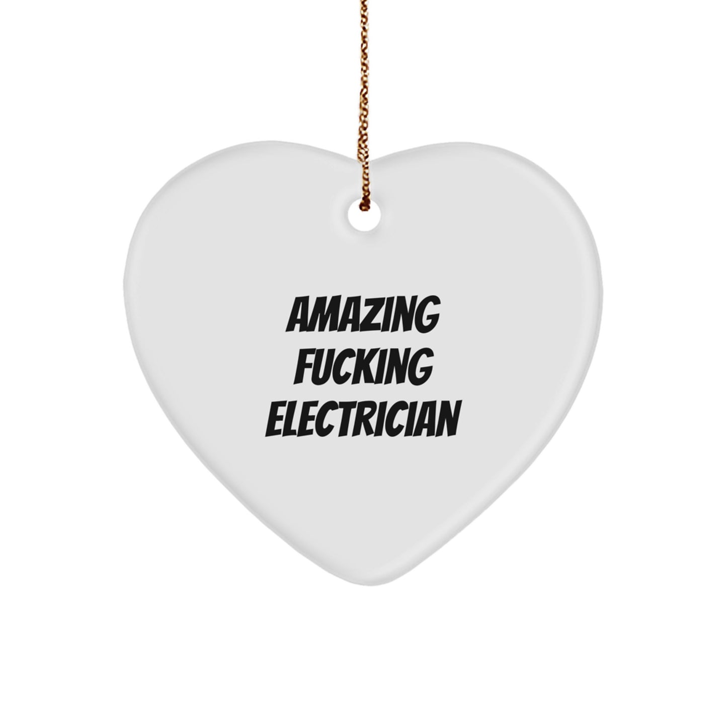 - This Electrician Heart Ornament is a fun and unique gift for Electrician friends or family members. It's crafted from sturdy MDF with a high-gloss plastic finish, making it a long-lasting and vibrant decoration. The quote 'Amazing F--king Electrician' is vibrantly printed from edge-to-edge via Sublimation, ensuring bright and vivid colors. This Heart Ornament is perfect for Electrician enthusiasts who love to display their passion in their home or office.