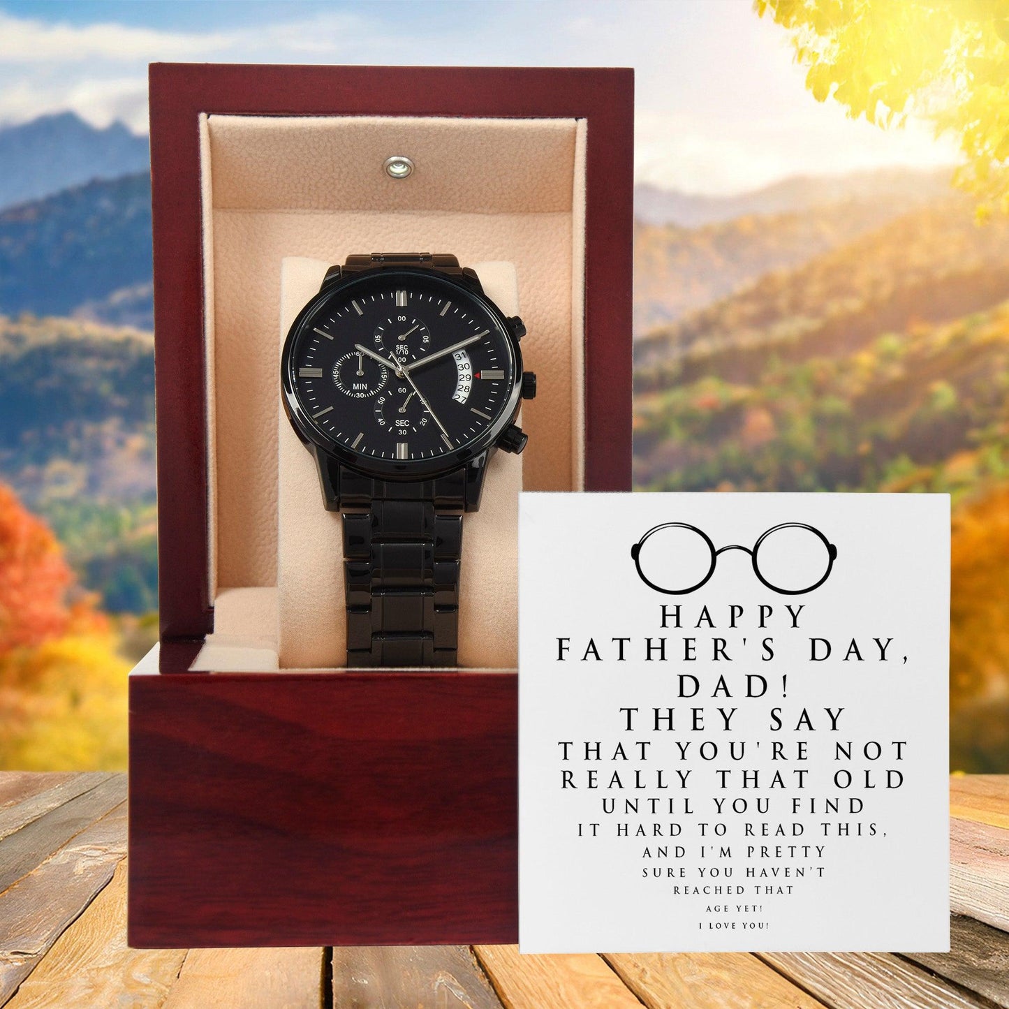 Funny Father's Day Black Chronograph Watch - "Not Really That Old Unless You Can't Read This" Message Card Gift from Son or Daughter