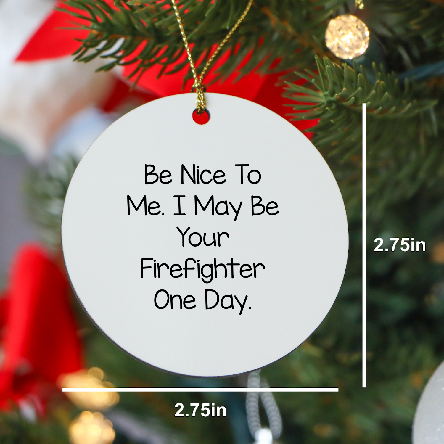 Make a statement this Christmas with our Funny Firefighter Circle Ornament, perfect for firefighter fans and sure to bring a smile to any brave hero’s face. Crafted from sturdy MDF and featuring vibrant sublimation colors, it’s both lightweight and break-resistant—ideal for homes with kids or pets. Whether you’re a firefighter or simply want to show appreciation, this gift is bound to be a hit. The playful quote, “Be Nice To Me. I May Be Your Firefighter One Day.” adds a fun touch that will spark laughter and joy. Firefighters are true heroes, and they deserve something just as special. Whether for a friend, family member, or coworker, this ornament is a thoughtful way to show your gratitude. Built to last and designed to brighten any space, it’s the perfect mix of funny and functional. Add a touch of heroism to your home with this charming keepsake and make this Christmas one to remember.