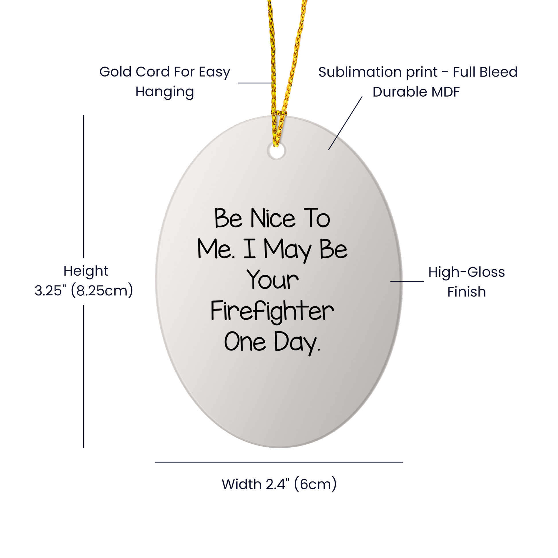 Looking for a funny and thoughtful gift for a firefighter friend or family member? The Firefighter Oval Ornament is just the thing. Crafted from durable MDF with a glossy plastic finish, it’s printed edge-to-edge in bright, vivid colors using sublimation. Featuring the playful and inspiring quote, “Be Nice to Me. I May Be Your Firefighter One Day,” it’s perfect for firefighter enthusiasts or anyone who loves a unique ornament. Whether you’re a firefighter yourself or simply an admirer, this gift is sure to bring a smile. Show appreciation for the brave men and women who protect us, and add a touch of humor to your holiday season. Why give a boring gift when you can give something truly special?