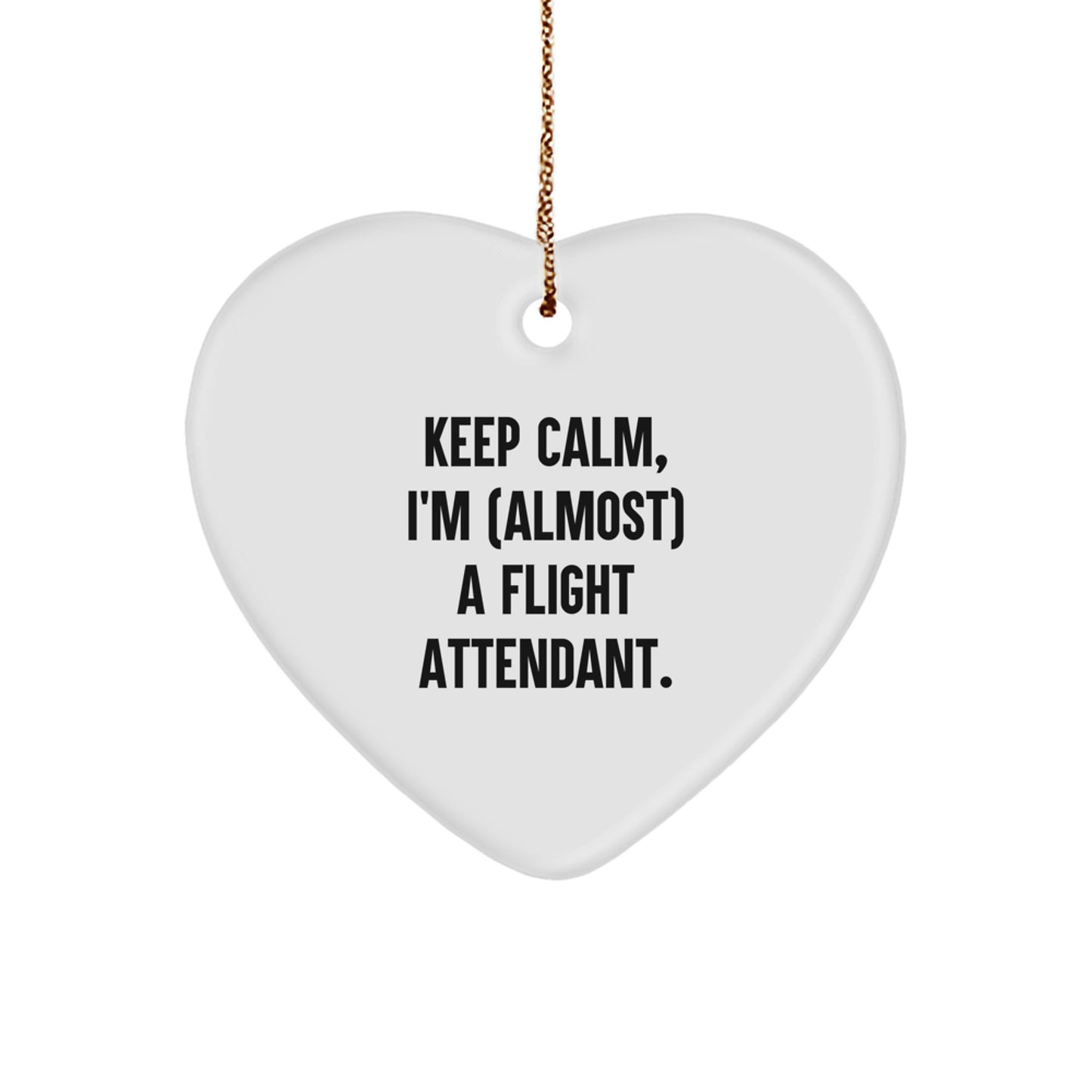 - Surprise a loved one with this special Heart Ornament, the perfect way to say 'Keep Calm, I'm (almost) A Flight Attendant', featuring a white heart shape with a beautiful design, and comes with a festive gold cord for easy hanging, making it easy to add to your Christmas tree or use as a wall decoration.