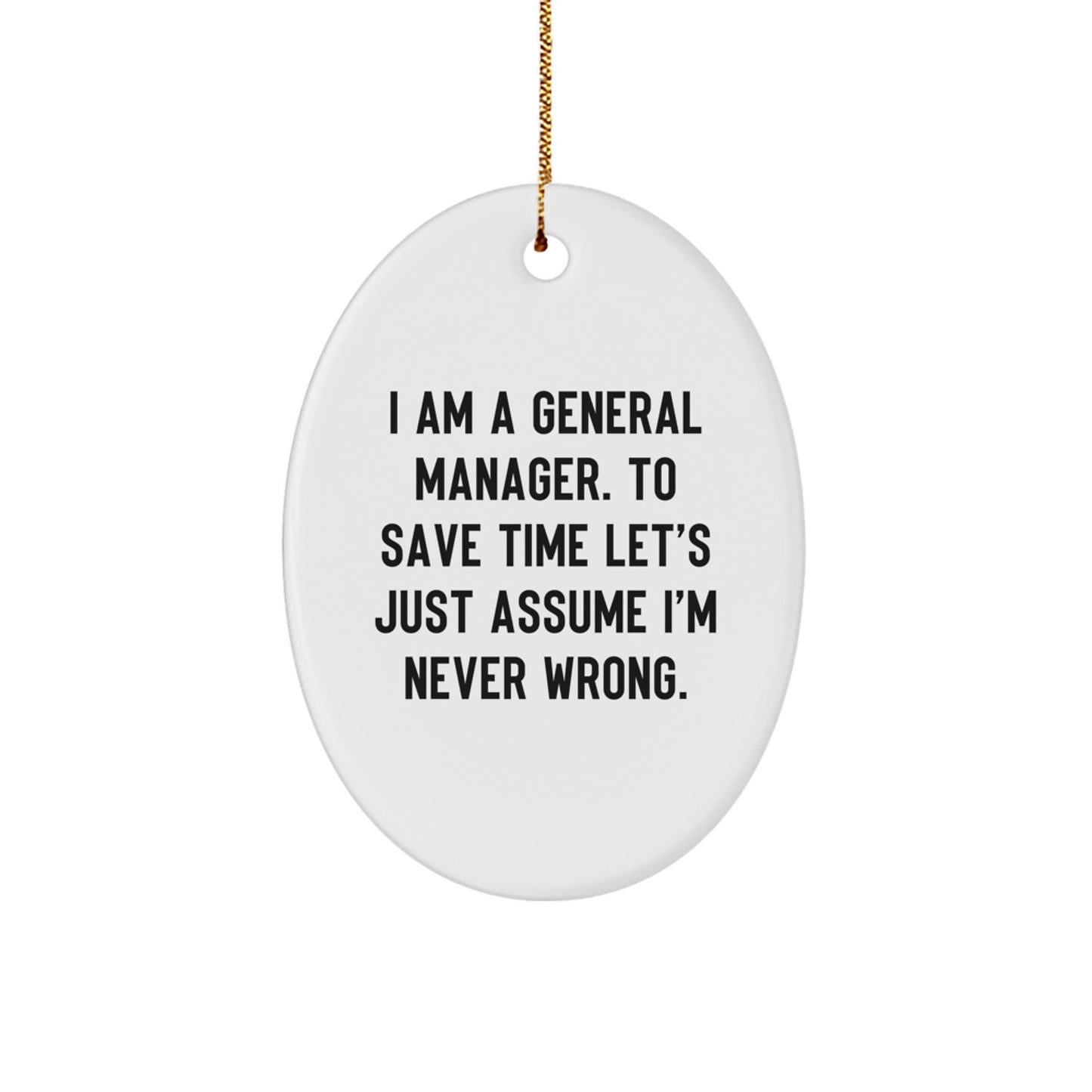 - This Oval Ornament is a thoughtful gift for any General Manager who loves to decorate their office space. The funny quote 'I Am A General Manager. To Save Time Let's Just Assume I'm Never Wrong.' adds a touch of humor to their decor. Made from sturdy MDF with a high-gloss plastic finish, this ornament is both long-lasting and vibrant. The lightweight design makes it perfect for households with children or pets.