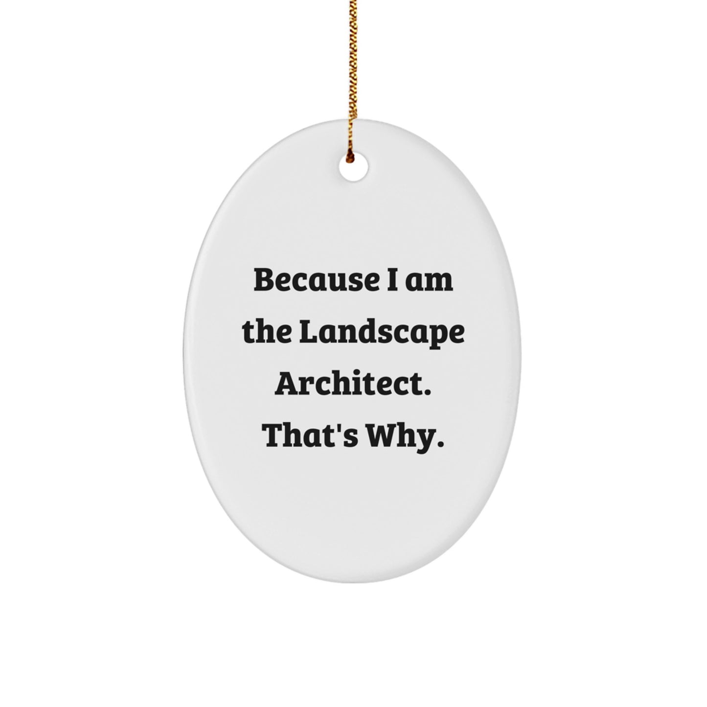 - Add a touch of professional flair to your holiday decor with this unique Oval Ornament, crafted by a Landscape Architect, because 'Because I Am The Landscape Architect. That's Why.' - This ornate piece is a perfect representation of the creative and artistic skills of a Landscape Architect, making it a thoughtful gift or addition to your own home.