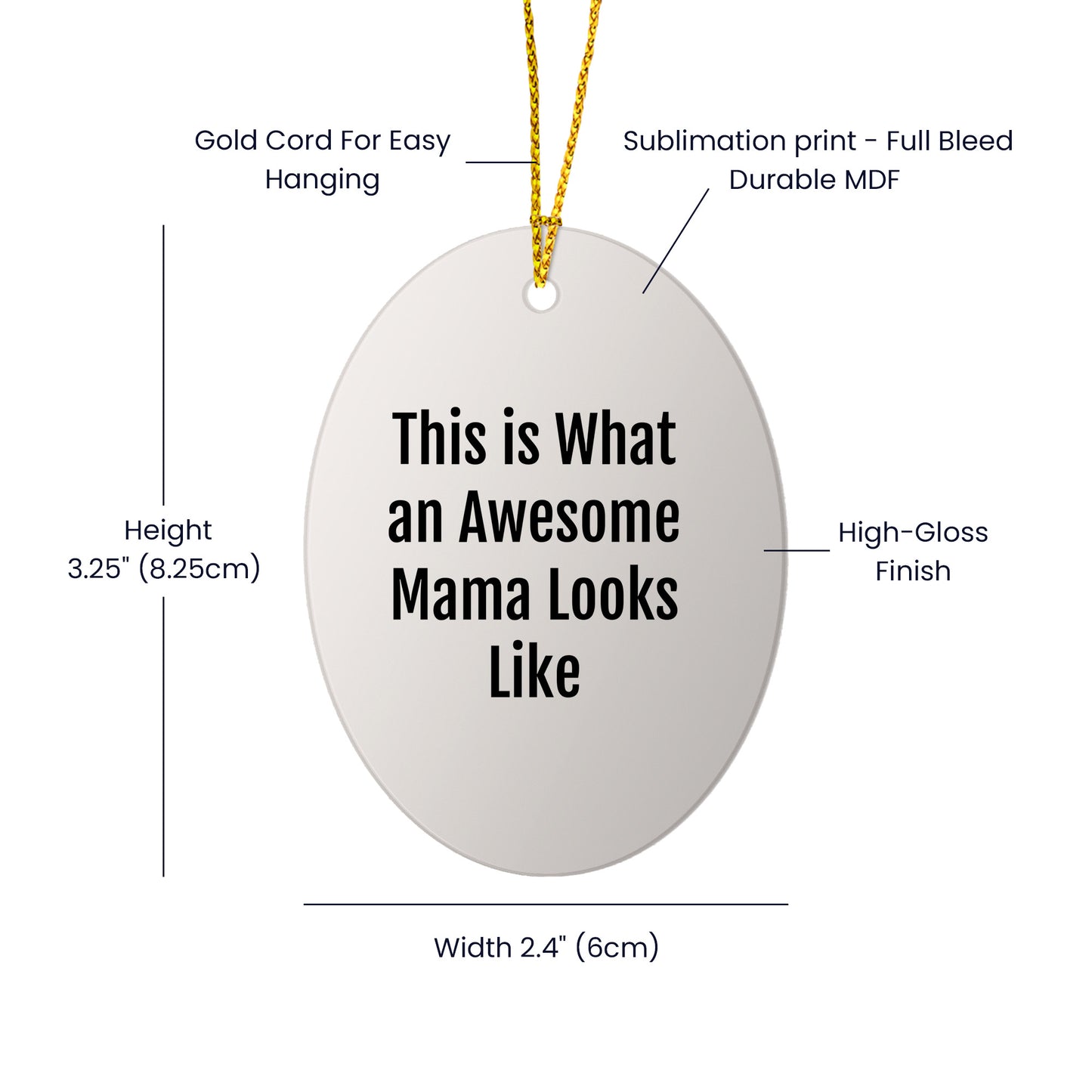 This is the ideal gift for Mama, a funny and inspirational quote that highlights her awesomeness. The 'This Is What An Awesome Mama Looks Like' oval ornament is a unique and thoughtful present for Christmas, crafted from sturdy MDF with a high-gloss plastic finish. It's lightweight, resistant to breaking, and features a vibrant, edge-to-edge sublimation print in white. This beautiful ornament ships with a festive gold cord for easy hanging, making it a stress-free decorating option. Share the love and appreciation for Mama this Christmas with this special gift from family or friends.
