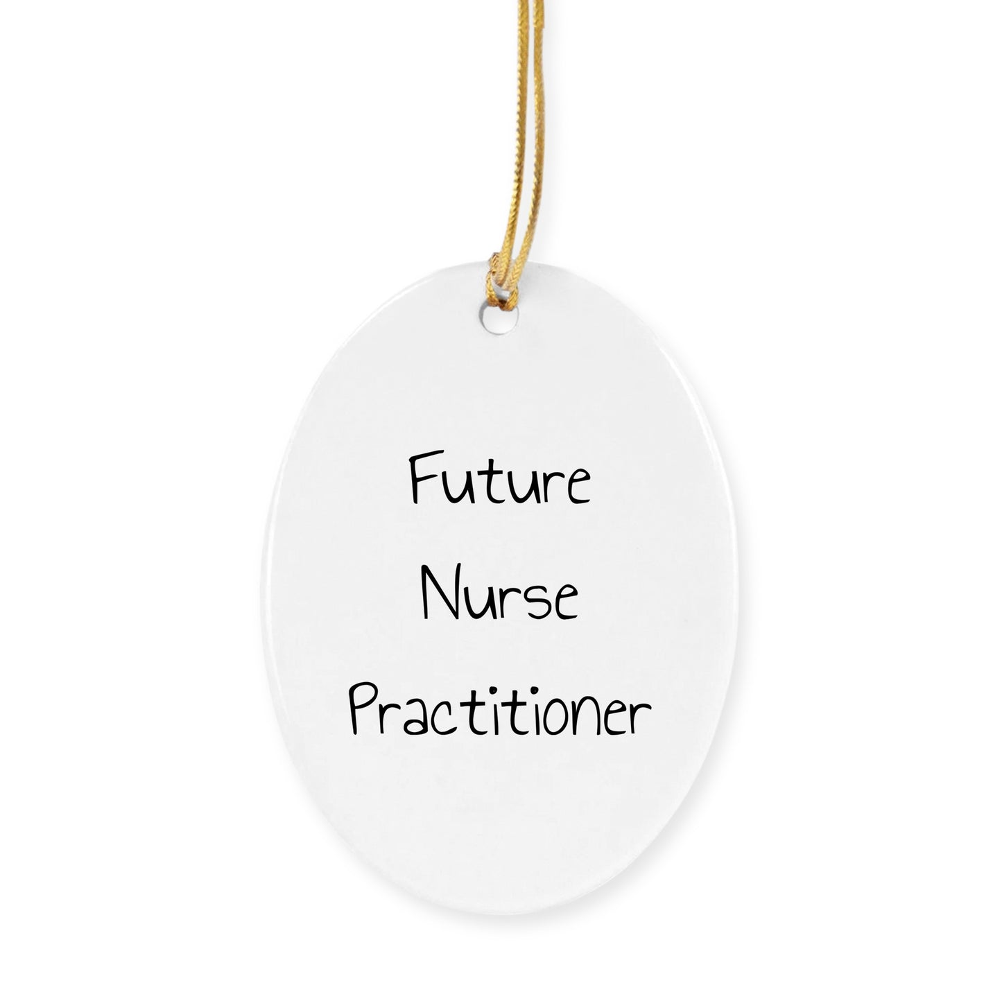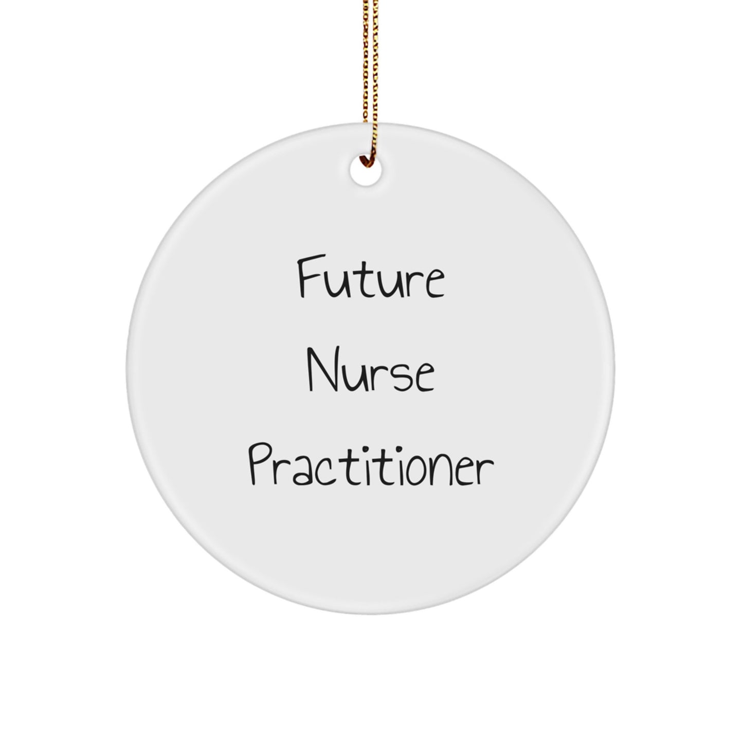 Looking for a thoughtful gift for a Future Nurse Practitioner? The humorous 'Future Nurse Practitioner' Circle Ornament is a great way to show support and appreciation for their journey. Made from sturdy MDF with a high-gloss plastic finish, this lightweight and durable ornament is vibrantly printed edge-to-edge via Sublimation. It comes with a festive gold cord for easy hanging, making it a safe and stylish choice for homes with kids or pets. Whether you're a friend, family member, or coworker, this gift is sure to bring joy this Christmas. Why not give a present that says, "I believe in you" and "You're going to make a difference"? Make this holiday season memorable with a thoughtful gift!