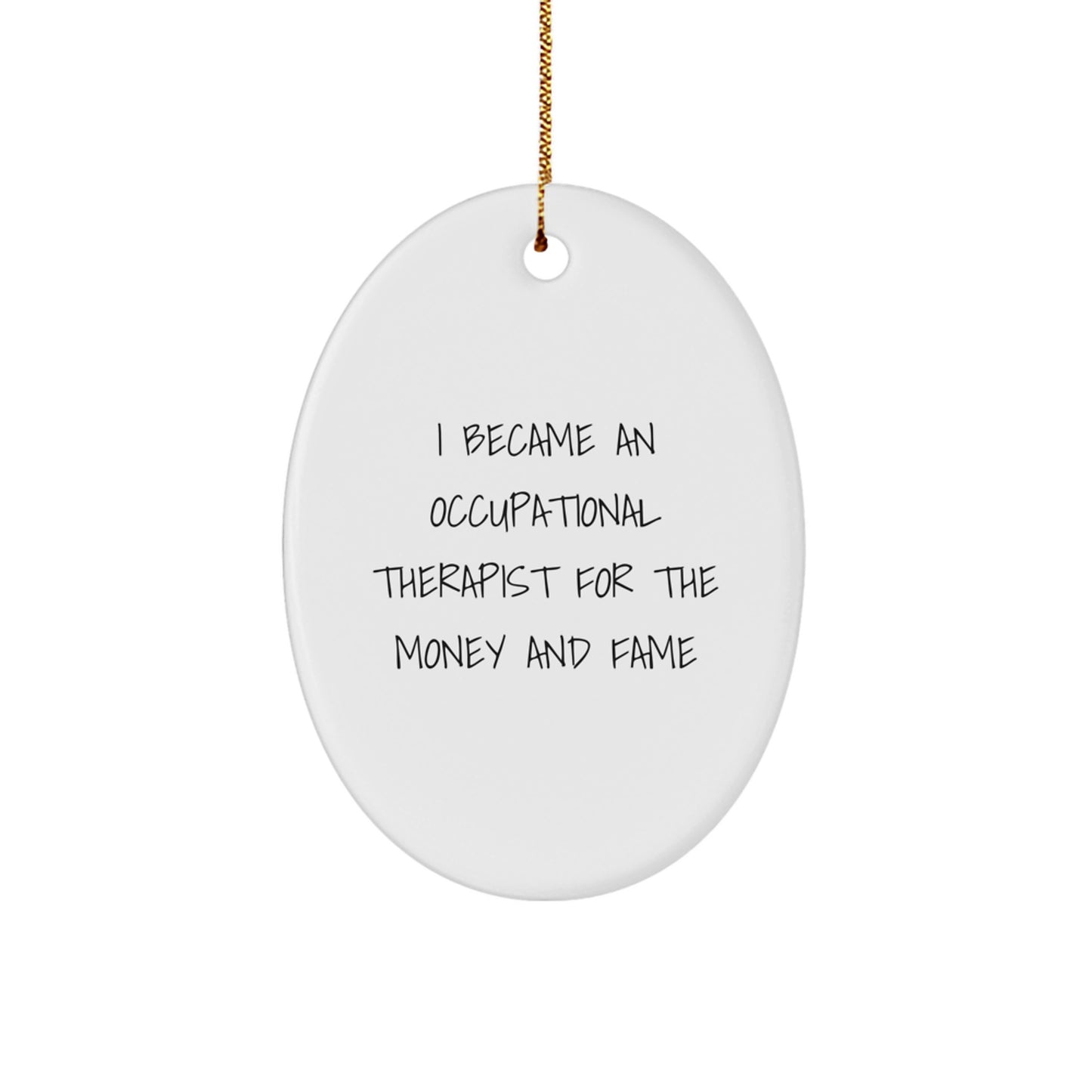 - This funny oval ornament is a unique and thoughtful gift for occupational therapists who became an occupational therapist for the money and fame. It's a great way to show your appreciation for their hard work and dedication. The vibrant white color and oval shape make it a standout on any Christmas tree or mantel.