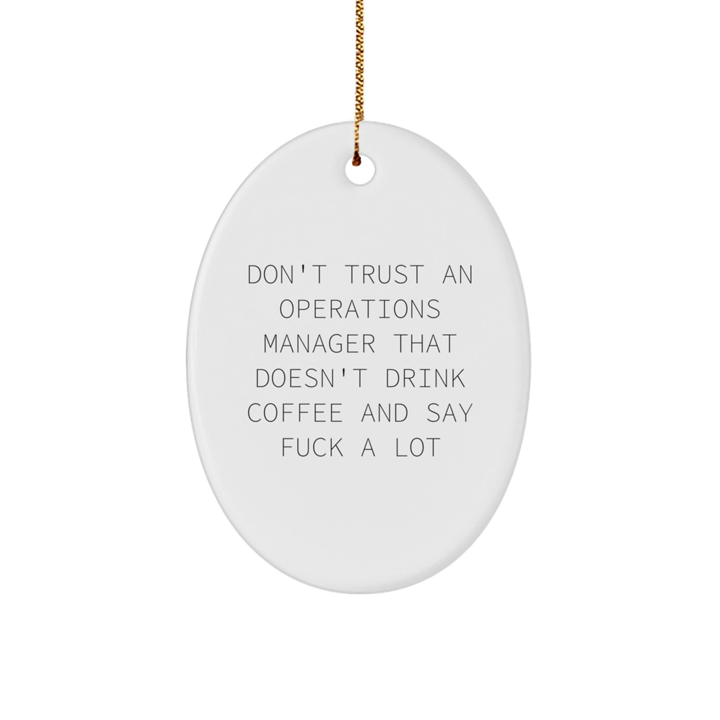 - Our Funny Quotes Oval Ornament is a great gift for Operations Manager enthusiasts who love to laugh and joke about their profession. The ornament is vibrantly printed with a funny quote 'Don't Trust An Operations Manager That Doesn't Drink Coffee And Say F--k A Lot' that will surely make them smile.