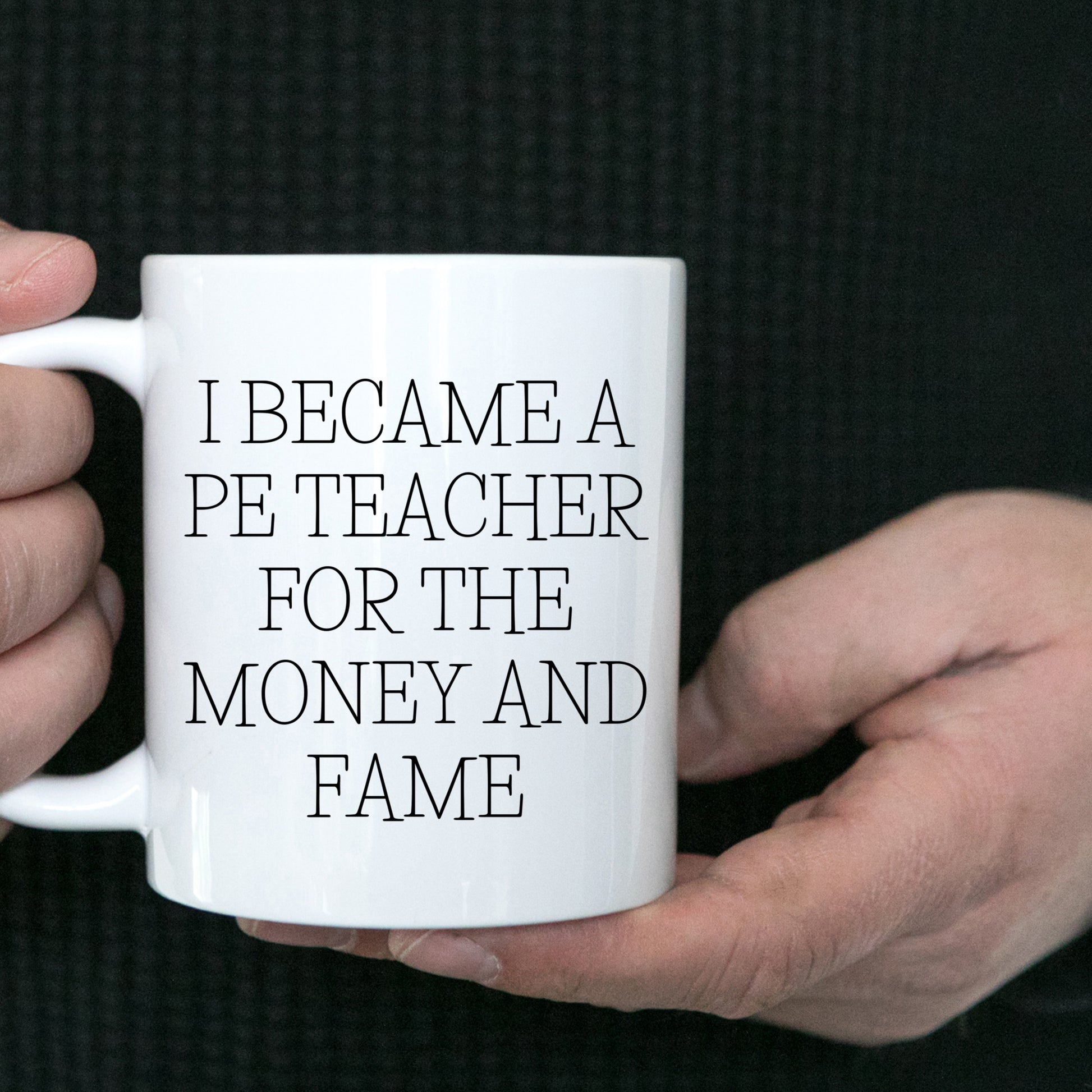 Whether you're shopping for a festive gift or treating yourself, this witty PE teacher coffee mug is a wonderful option. It humorously reflects on becoming a PE teacher for the money and fame while serving as a unique gift for any PE teacher. Don't wait—order yours today!