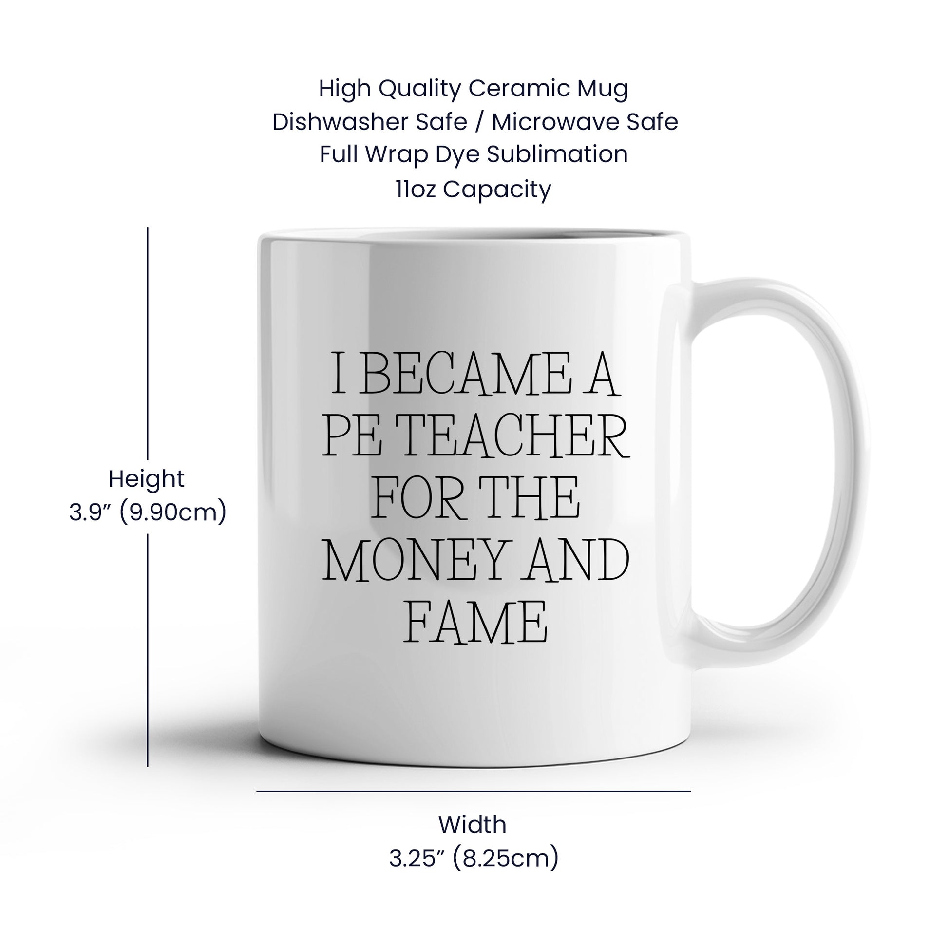 Funny PE Teacher Gifts for Men, Women, or Friends, White Coffee Mug, I Became A Pe Teacher For The Money And Fame Christmas Unique
