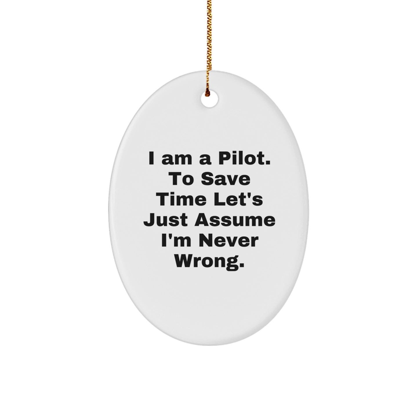 - This funny pilot ornament is made from sturdy MDF with a high-gloss plastic finish, making it a great choice for households with children or pets. It's lightweight and resistant to breaking, making it perfect for stress-free decorating. The quote 'I Am A Pilot. To Save Time Let's Just Assume I'm Never Wrong.' is vibrantly printed from edge-to-edge via Sublimation, ensuring bright and vivid colors.