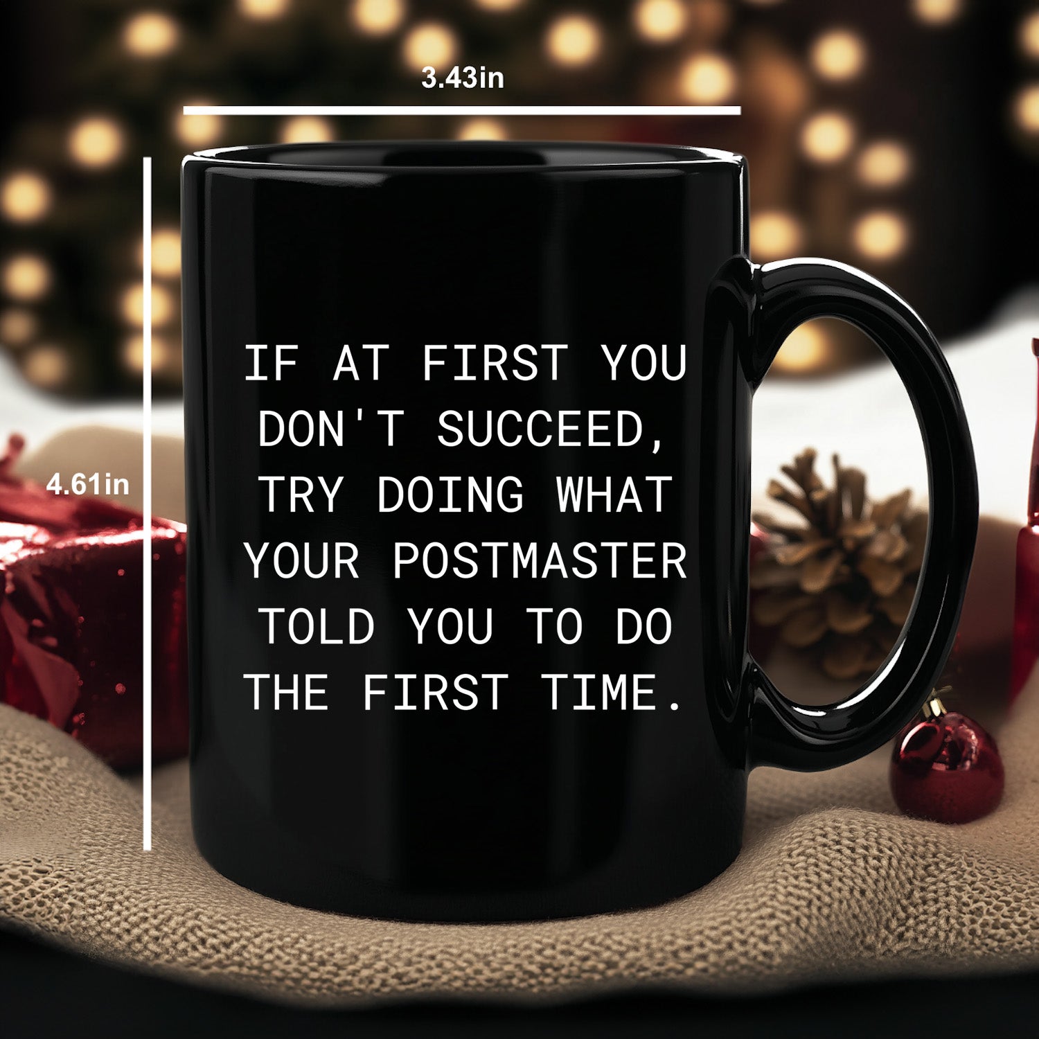 Celebrate your love for the Postmaster with this unique black coffee mug, ideal for the postal enthusiast in your life. Give the gift of humor with the Postmaster-themed mug featuring the quote, "If At First You Don't Succeed, Try Doing What Your Postmaster Told You To Do The First Time." Made of high-quality ceramic, these mugs are available in 11oz and 15oz sizes, perfect for daily coffee needs. For pun lovers, this mug is a great way to add humor to their morning routine. Add this playful and thoughtful mug to your Christmas gift list and brighten someone's day. Just add it to your cart and get ready to make their holiday special!