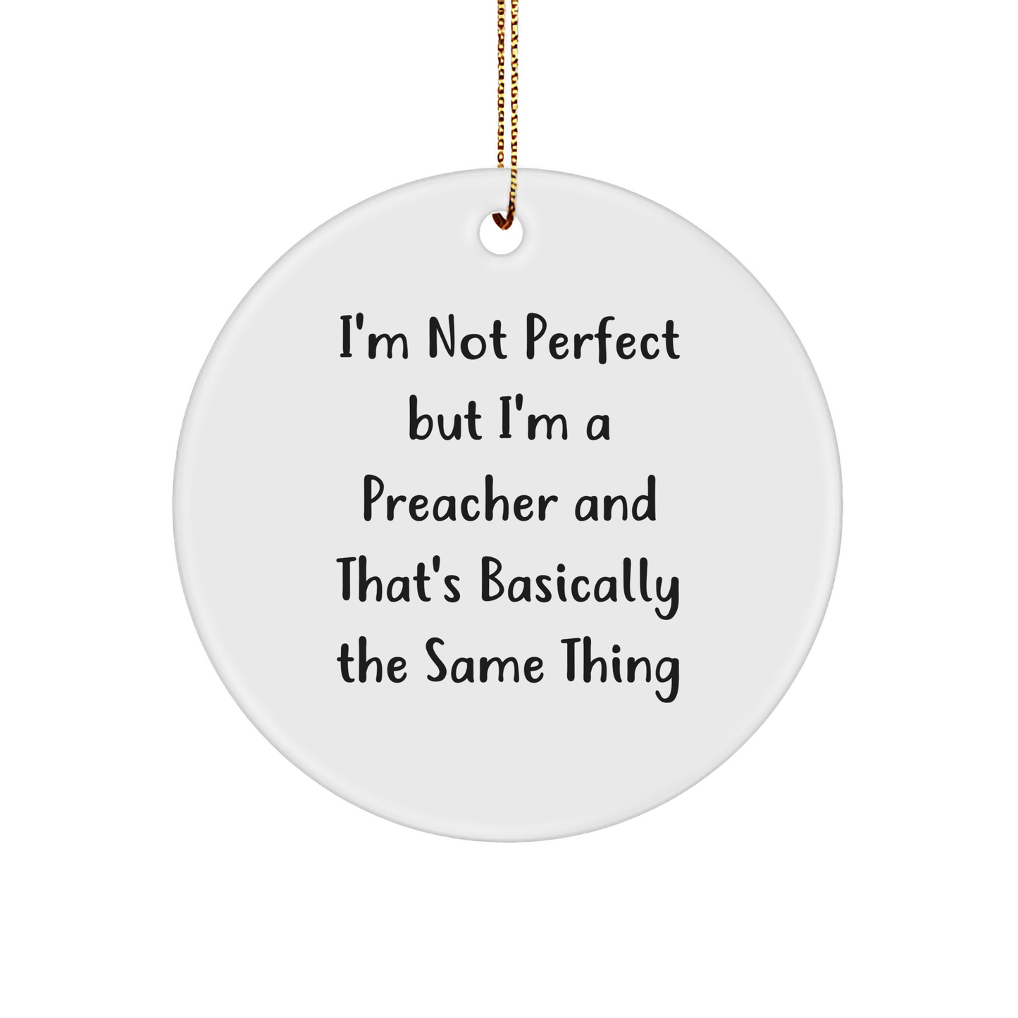- 'I'm Not Perfect But I'm A Preacher And That's Basically The Same Thing' is proudly displayed on this beautiful Circle Ornament, making it a unique and thoughtful gift for friends and family. With its vibrant white color and circle shape, it's a stunning addition to any Christmas decoration. (199 characters)