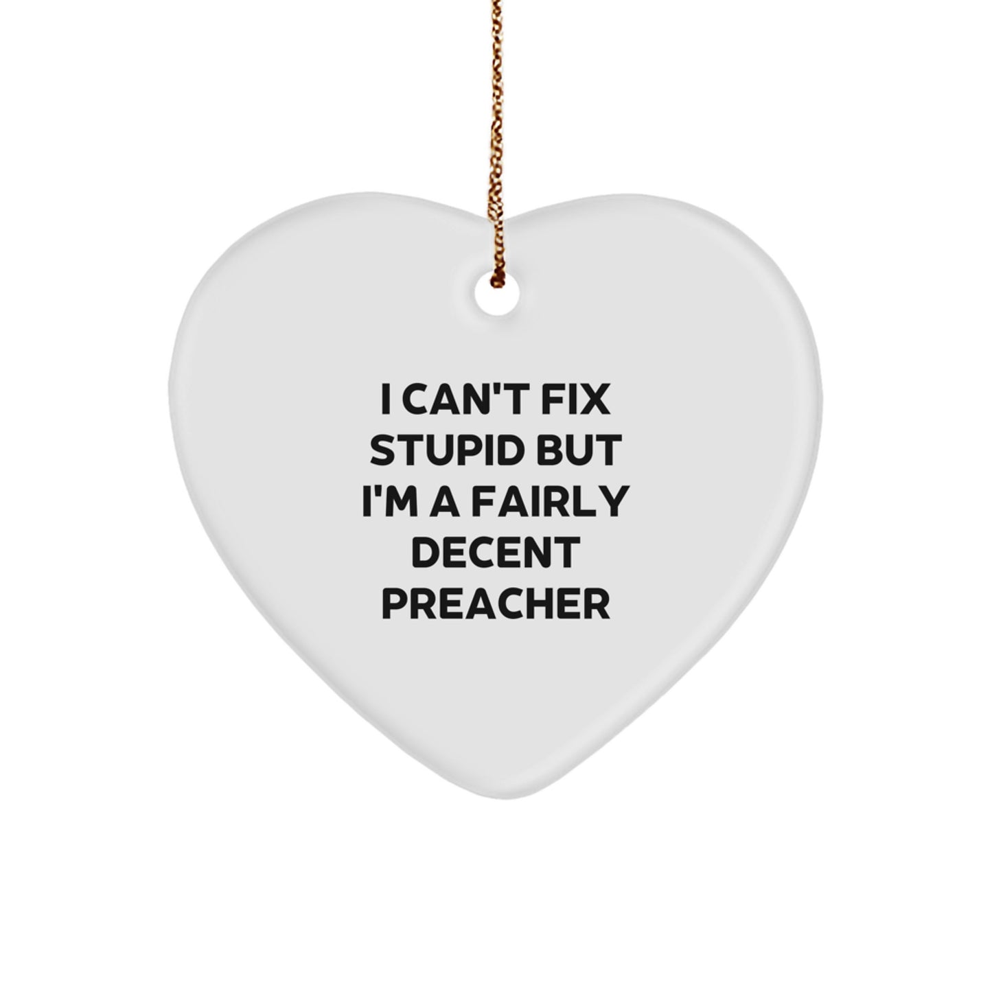 - The quote, 'I Can't Fix Stupid But I'm A Fairly Decent Preacher', is a humorous take on the challenges of being a Preacher. It's the ideal gift for any Preacher who appreciates a good laugh and a unique way to decorate their home. Our heart ornament is a great way to show your appreciation for their hard work and dedication to their faith.