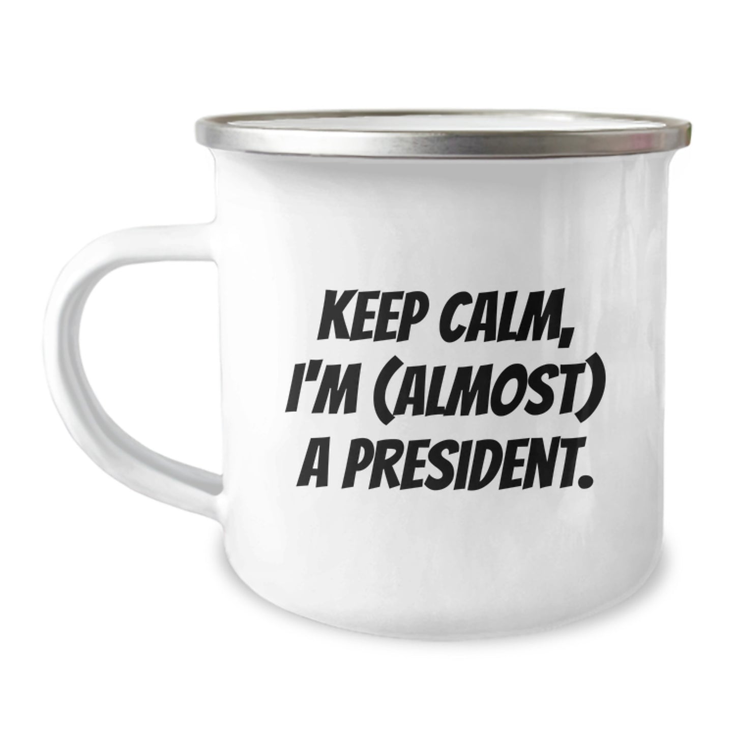 - Whether it's a Christmas gift or a present for any occasion, this mug is sure to be a hit. So why wait? Get your Keep Calm I'm (almost) A President Camping Mug today and make someone's day a little brighter!
